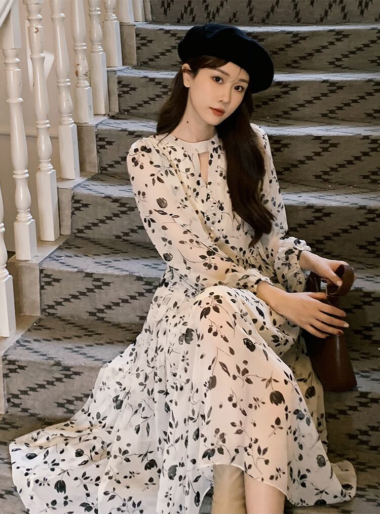 花柄スカート 冬 春 優しくて甘いデザイン ワイドスリーブ ミドル丈 Aラインワンピース レディース XS S M L ワンピース フレアスカート ワンピドレス ロング 襟付き フレア プリーツ かわいい シフォン きれいめ 上品 おしゃれ ラブリー ガーリー 柄 10代 20代 韓国系 | ameiro18
