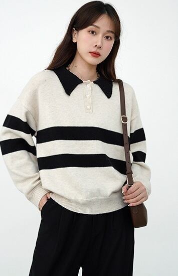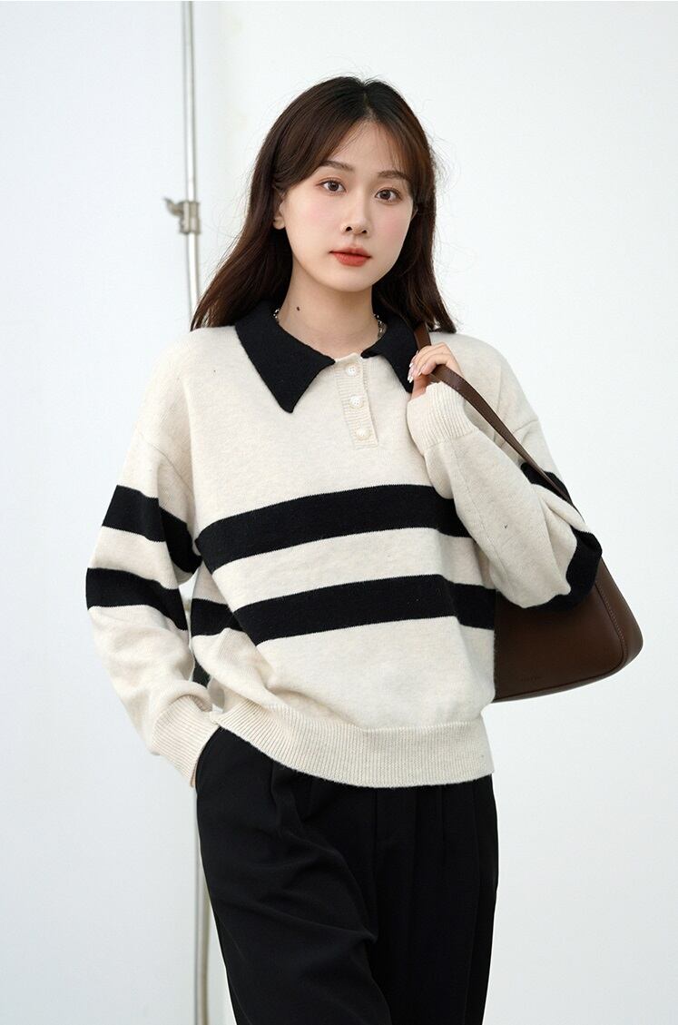 白黒カラー コントラスト ストライプ ニット トップス レディース 秋 冬 ゆったり 薄手 ポロカラー セーター S M L トップス 襟付き 大人可愛い カジュアル 大人 おしゃれ 10代 20代 30代 40代 女性用 学生 デート お出かけ 公園デビュー 女子会 普段使い コーデ | ameiro18