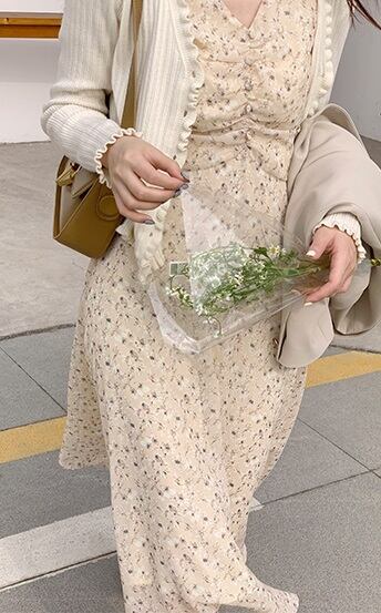 超美配色 やさしい風 クリームプリントワンピース スリムウエスト Vネック シフォン 上品なミドル丈スカート XS S XL ワンピース 膝下 長袖 Vネック 大人可愛い きれいめ 大人 上品 おしゃれ 大人可愛い 大人女子 花柄 10代 20代 30代 40代 50代 レディース 女性用 オフィス ビジネス OL 通勤 学生 通学 デート お出かけ 公園デビュー 休日 イベント