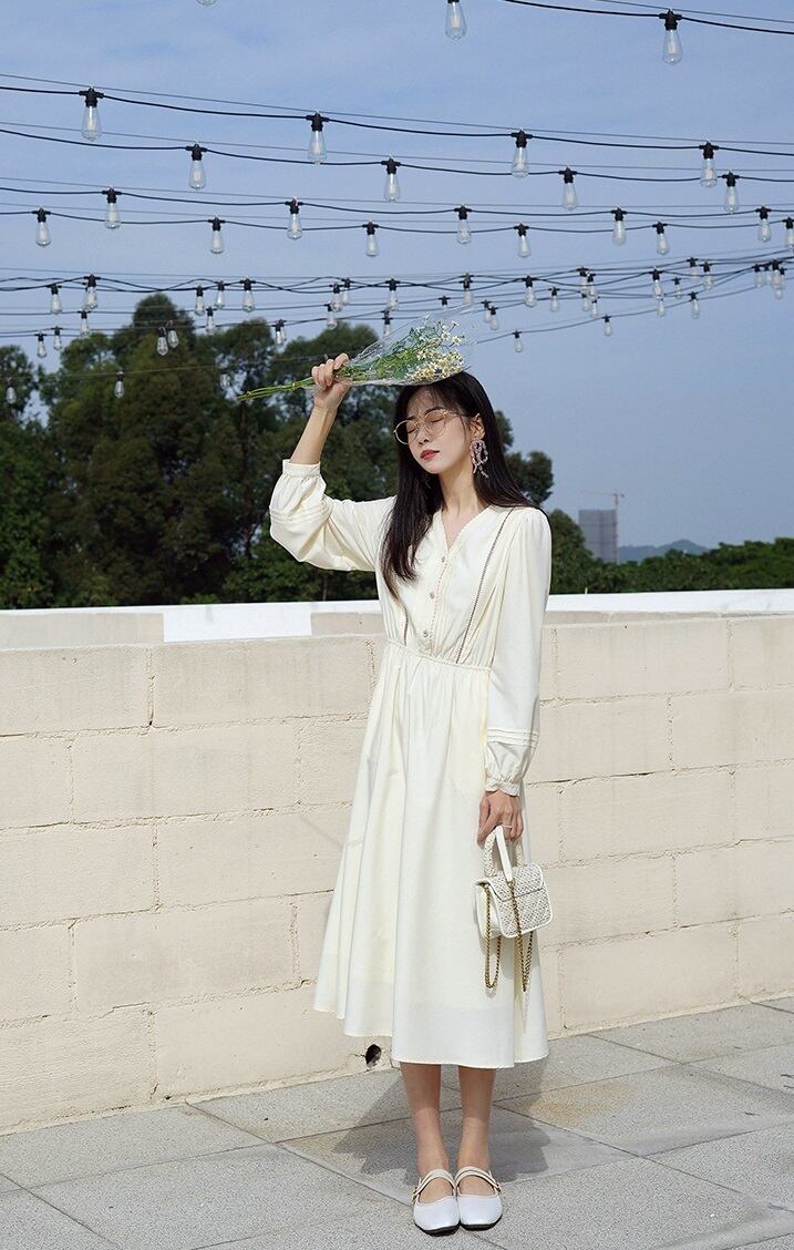 スウィート ホローレース エッジプリーツ Vネック レディースタイル ワンピース スリム見え お肉をやさしくカバー 春 秋 S ワンピース 膝下 ミモレ ミモレ丈 袖あり 長袖 Vネック セミフレア かわいい 大人可愛い きれいめ シンプル 大人 上品 おしゃれ お洒落 大人可愛い 大人女子 10代 20代 30代 40代 デート お出かけ 公園デビュー 女子会 お泊まり 休日 パーティー イベント リゾート 旅行
