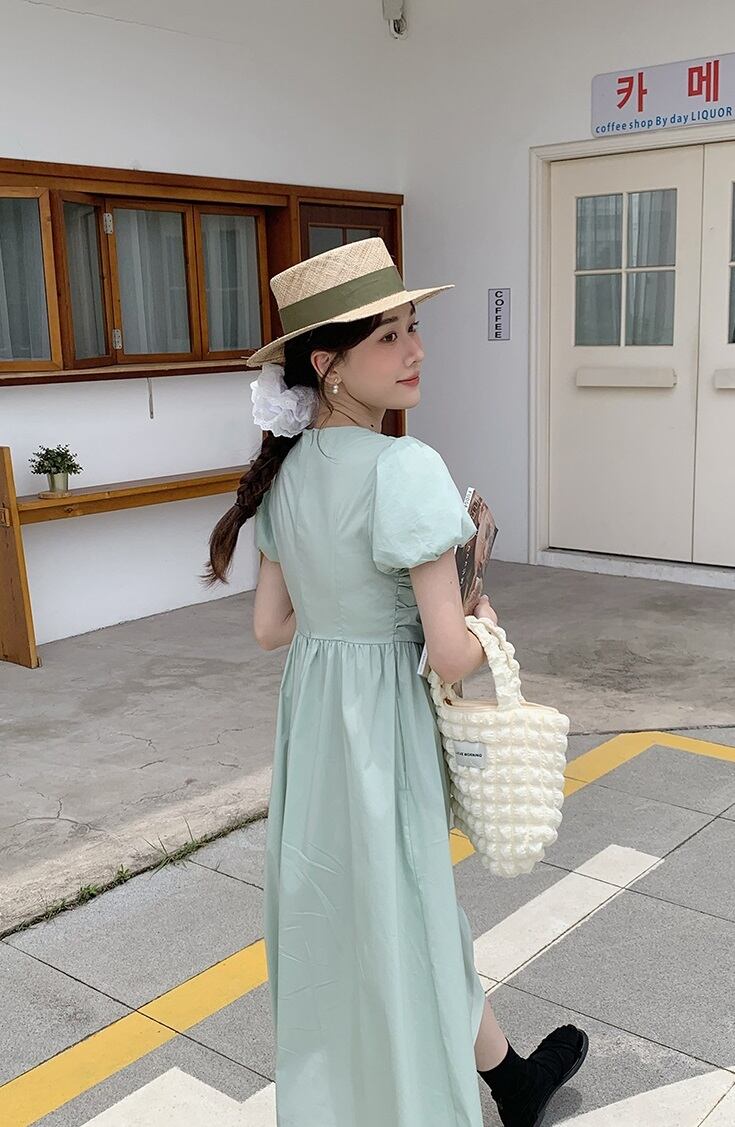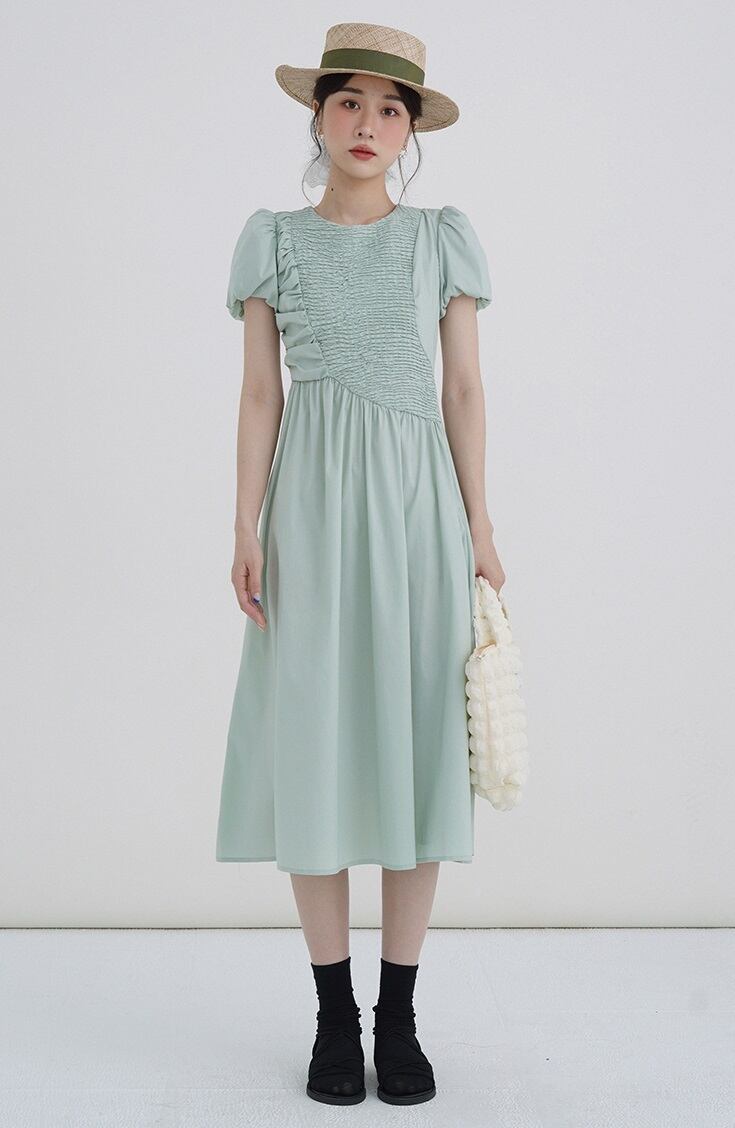 プリーツドレス 女性 春 夏 涼しさ ファッション デザイン パフスリーブ ミドル丈スカート XS S M L