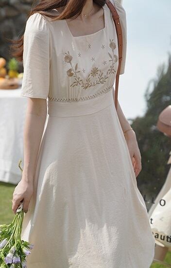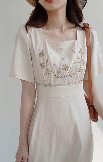 花刺繍 レトロ スクエアネック 文学的で芸術的なスリムドレス 女性 夏