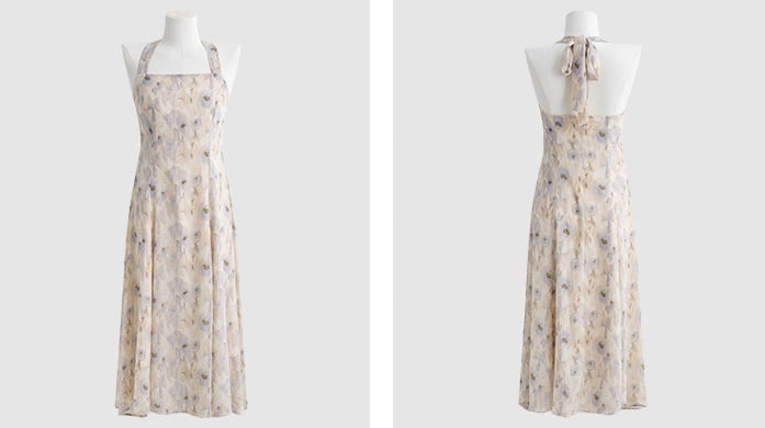 美しい水彩プリントが施された、吊りネックバックレスのシフォンドレス。軽やかな素材感が暑い季節にぴったり。ハイウエストデザインで、スタイルアップ効果も抜群です。花柄の可愛らしさと、レディな印象を兼ね備えた一枚。XSからXLまでのサイズ展開で、1枚で楽しめるカジュアルなデイリータイプから、パーティーシーンにぴったりのエレガントなデザインまで、様々なシーンで活躍すること間違いなしです。大人の女性にも、10代・20代の女性にも合う上品なデザインは、コーディネートの幅を広げてくれます。夏のお出かけや旅行には必見のアイテムです。