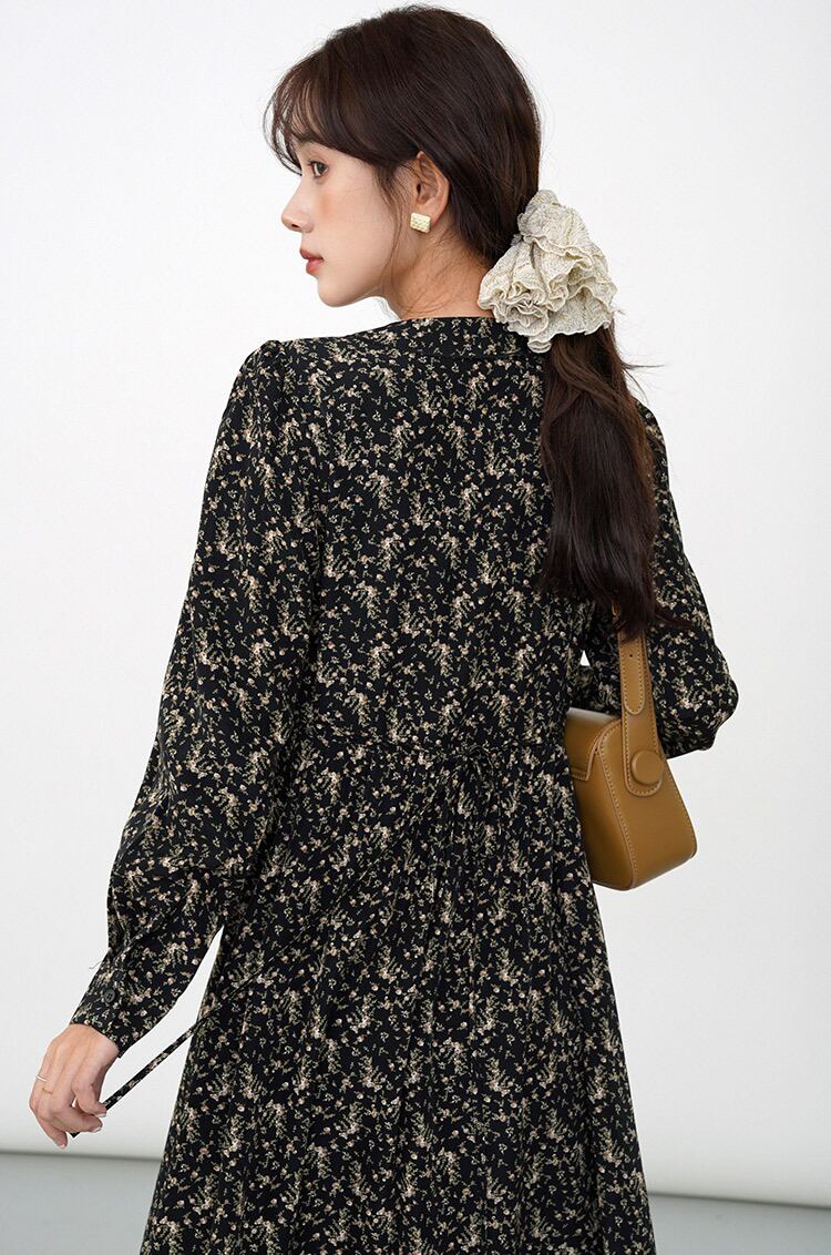 ブラック フローラル ドレス ネックプリント 厚手シフォン フレンチ 長袖ドレス XS S M L XLワンピース 膝下 袖あり 長袖 Vネック かわいい 大人可愛い きれいめ シンプル カジュアル 大人 上品 おしゃれ お洒落 大人可愛い 大人女子 キュート ガーリー 柄 春 秋 冬 10代 20代 30代 40代 50代 レディース 女性用 オフィス OL 通勤 通学 デート お出かけ 公園デビュー 女子会 休日 リゾート 旅行 海 プール 普段使い | ameiro18