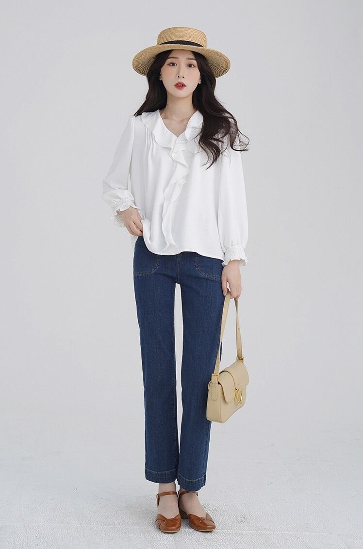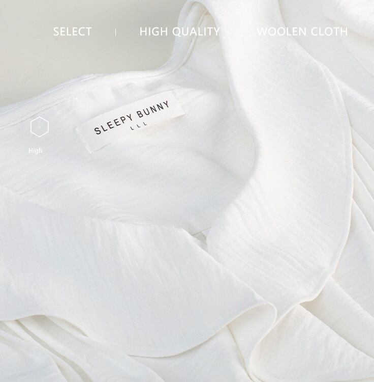 シンプルな白シャツにフリルのシフォンがアクセント。10代から40代まで幅広く着用可。