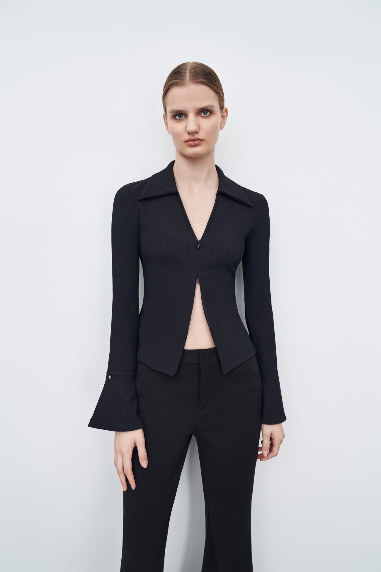 冬女性 ホットガールスタイル 双方向ジッパートランペットスリーブ Tシャツ 華やかクール シック ブラック XS S M L XL トップス Tシャツ シャツ 袖あり 長袖 Vネック 襟付き スリム タイト 細身 ストレート スマート シンプル 大人 上品 おしゃれ お洒落 かっこいい エキゾチック クール エレガント 主役級 存在感 無地 春 夏 秋 冬 オールシーズン シーズンレス 成人式 入学式 卒業式 謝恩会 二次会 10代 20代 30代 40代 50代 60代 レディース メンズ | ameiro18