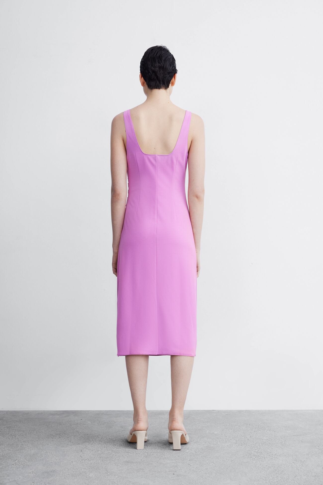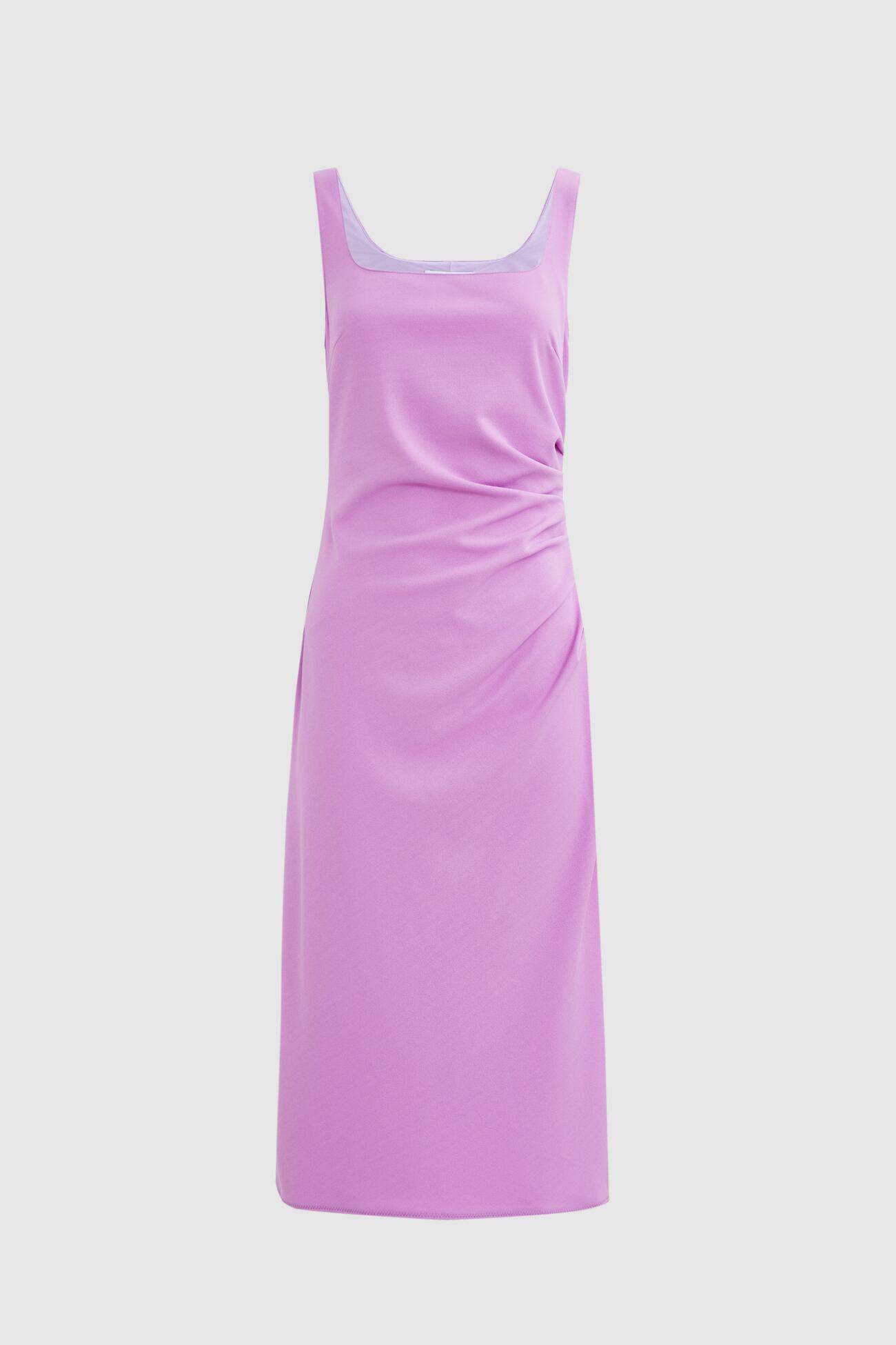春夏にぴったりの軽やかなワンピースです♪ フロントにあしらったシャーリングとサイドスリットが、女性らしいシルエットを演出してくれます。長すぎず短すぎない絶妙な丈感なので、オフィスや学校などのちょっとしたお出かけにもおすすめ。
