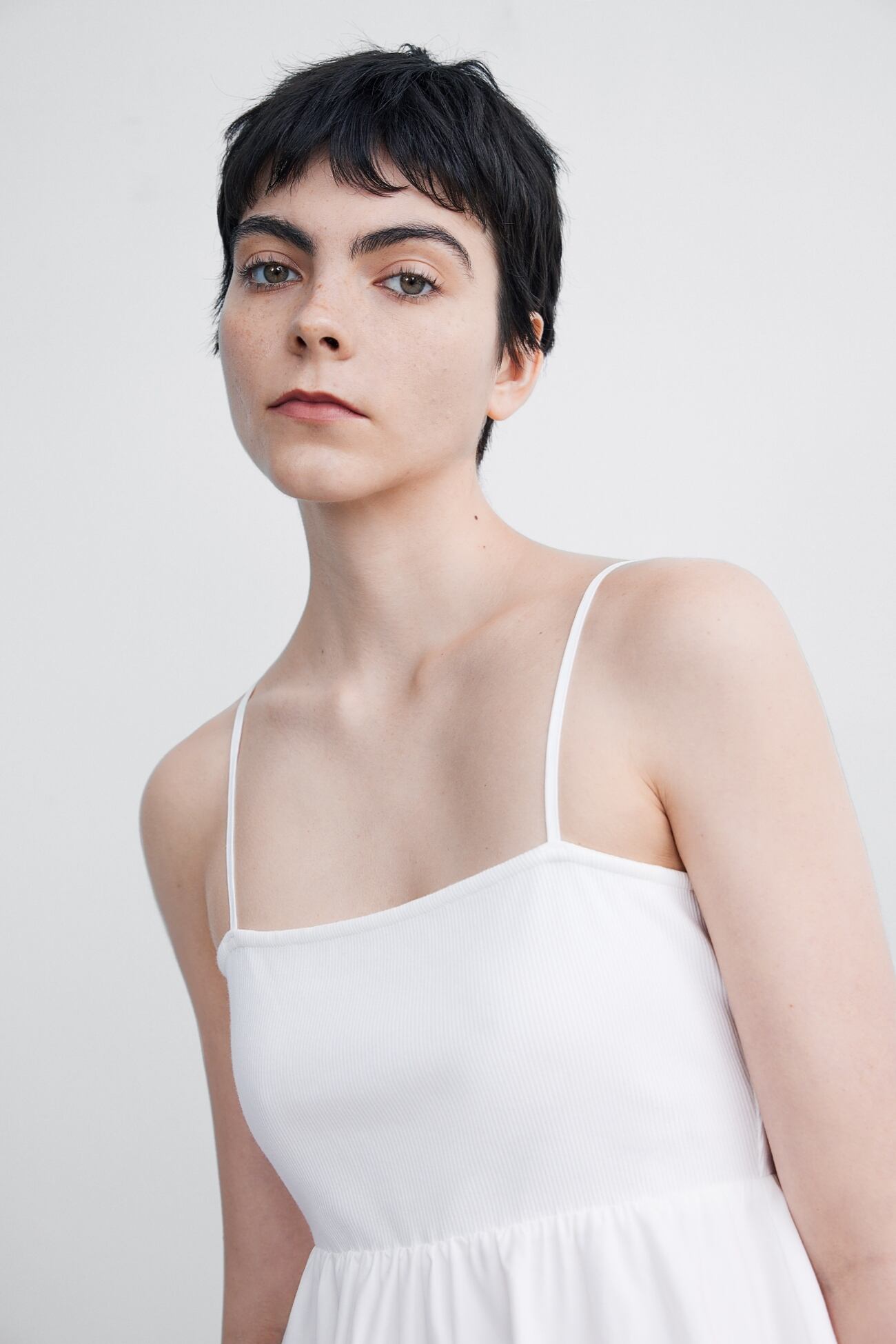 夏は膝上丈で、涼しげな印象に。秋にはストッキングを合わせて、長袖でオフィスや通勤でも活躍。また、サスペンダーが外せばノースリーブワンピースとしても着用可能です。