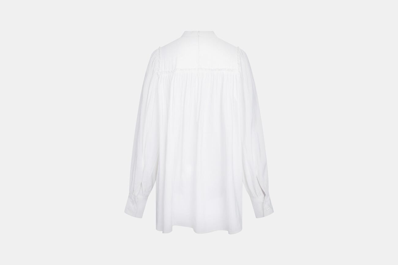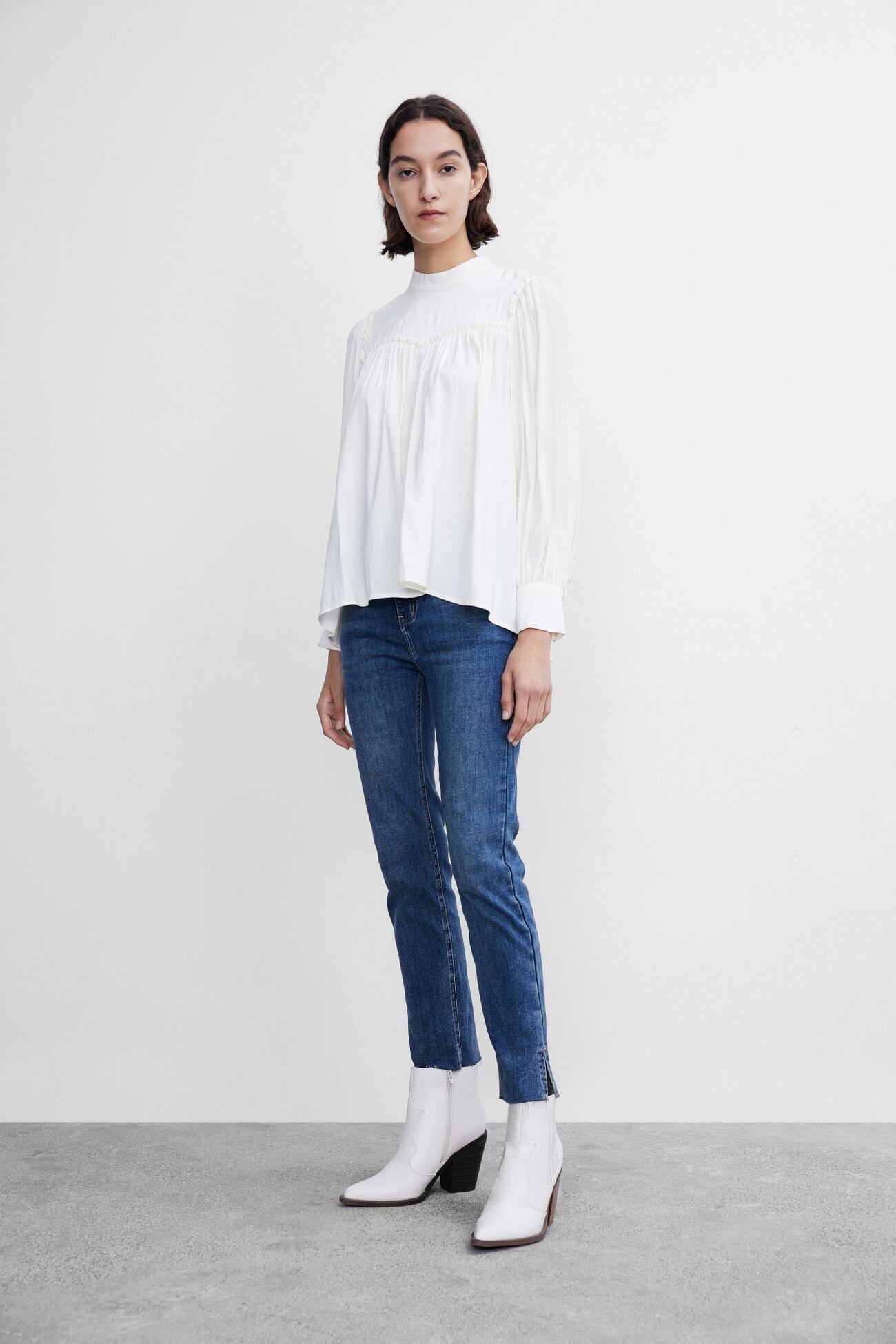 このブラウスは、レディな印象を与えるハイネックと、シャープで腕を細く見せる切り替えデザインが特徴。フレンチやレトロなど、様々なスタイルに合わせて着こなせます。また、シンプルで大人上品な見た目なので、オフィスやデート、普段使いにも最適。軽くて通気性のある薄手の素材を使用しているため、春夏秋冬オールシーズン着用いただけます。