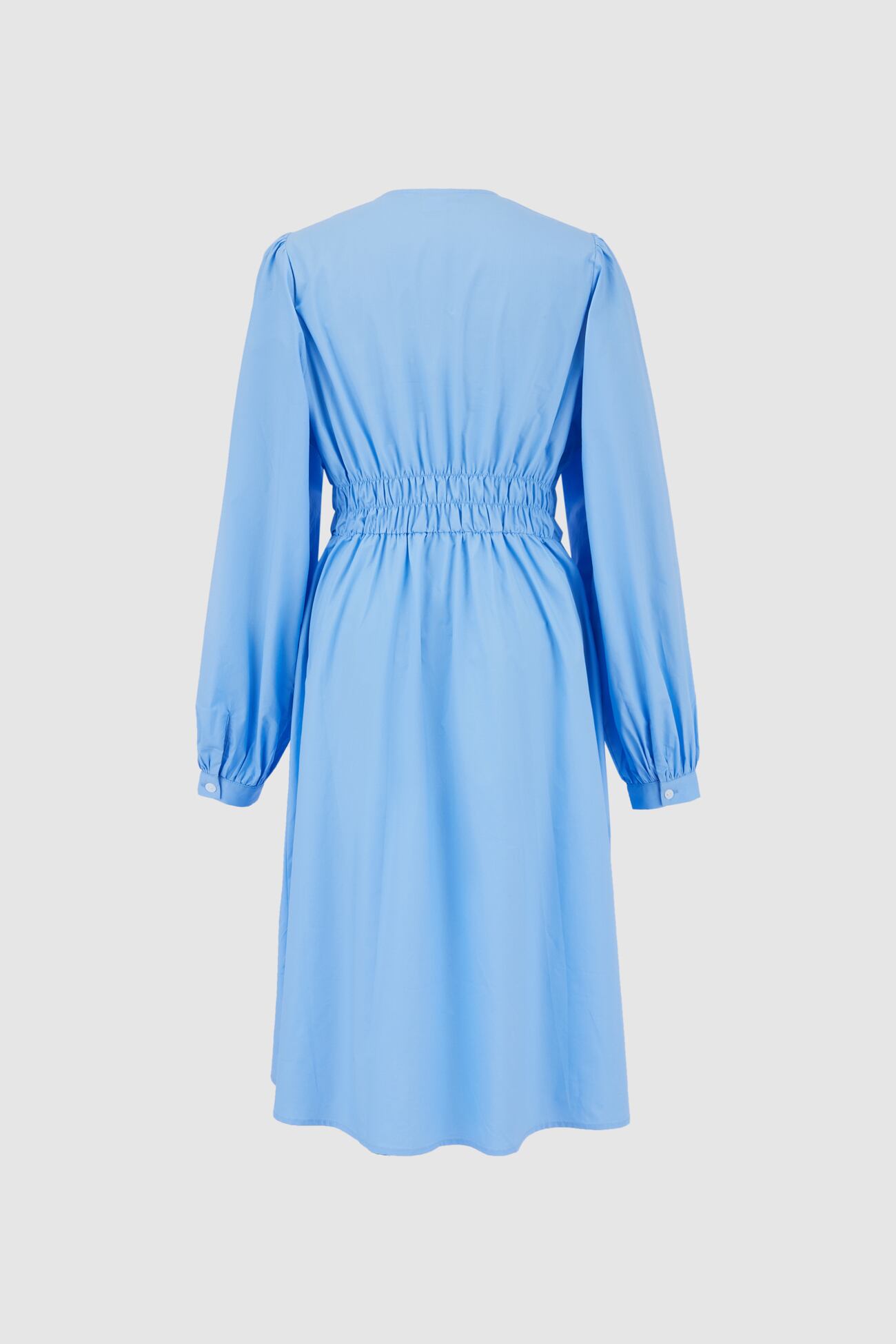 Vネックでデコルテラインを美しく見せ、程よい袖丈で大人上品な印象を与えます。綺麗なライトブルーとグレーブルーの色展開で、季節を問わず着用できます。サイズはXS〜XLまで展開し女性の体型にフィットするよう調整しています。また、プリーツが入っているので、着心地も良く動きやすいのも特徴です。