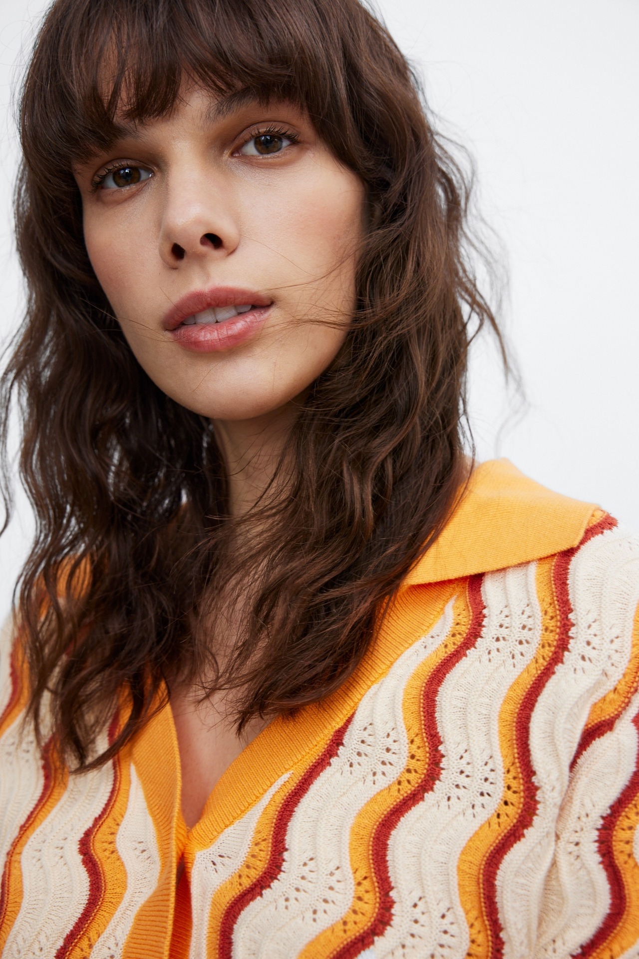 甘い雰囲気が魅力の春夏婦人服、アメリカンレトロ ウェーブ ストライプ Vネック ニットジャケットをご紹介します。レビューでもお褒めいただいている通り、今シーズンのトレンドであるカジュアルでも派手でもない上品さと、華やかなオレンジの配色が絶妙にマッチしています。