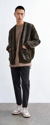 商品名にもある通り、レトロな感じのストライプ柄が魅力のVネックセータージャケット。秋冬のコーディネートにぴったりの一枚です。