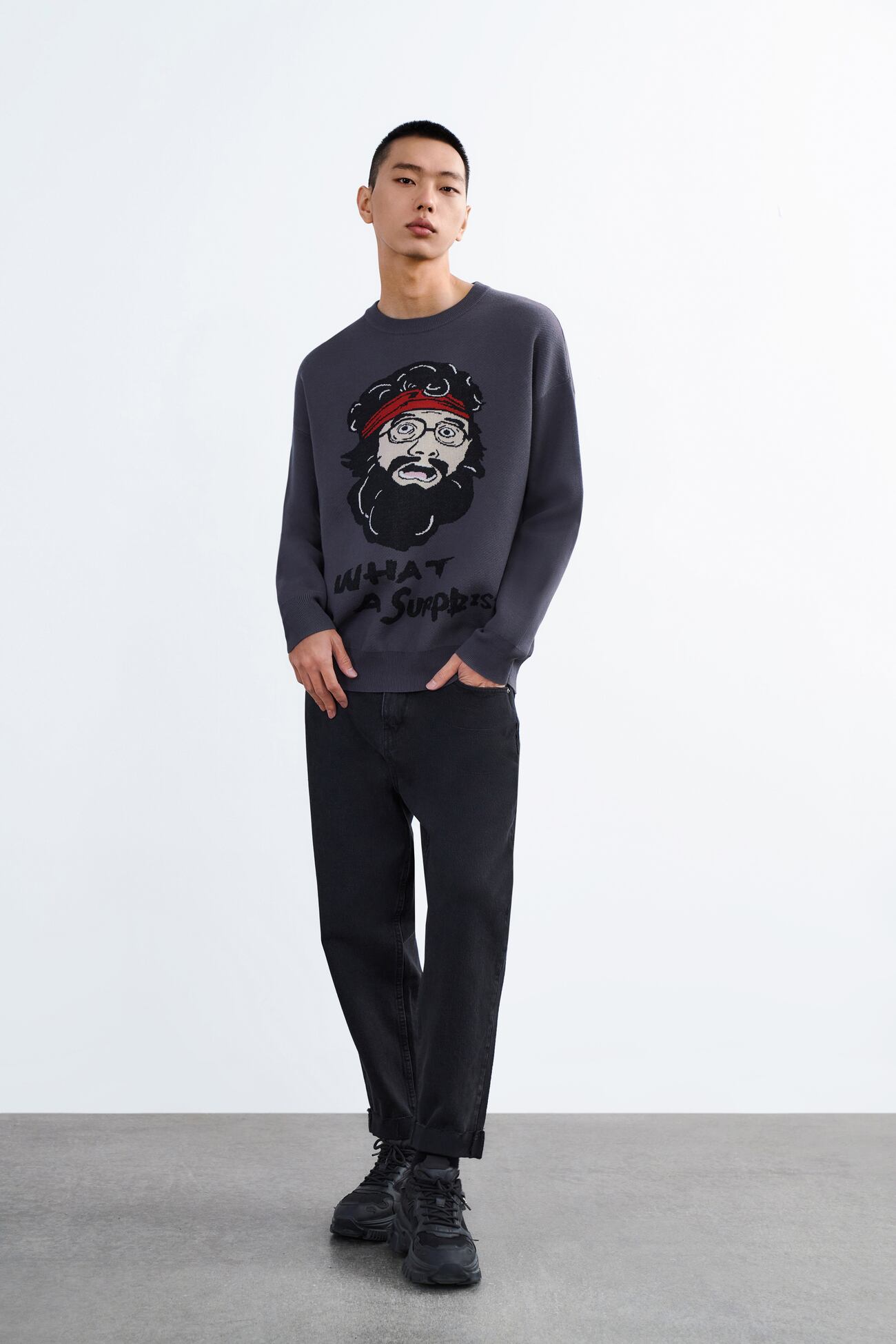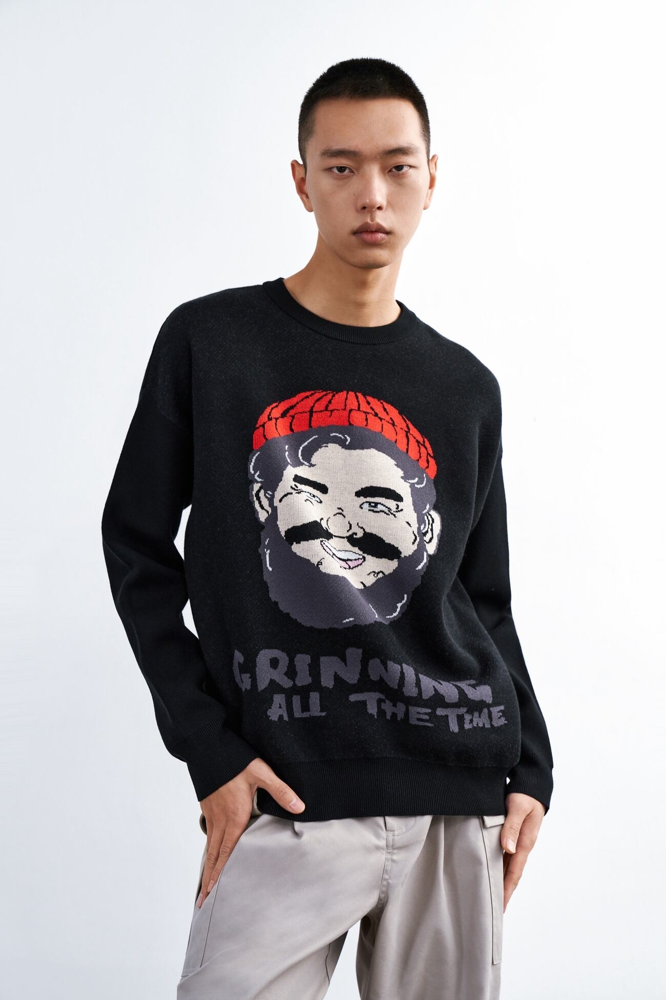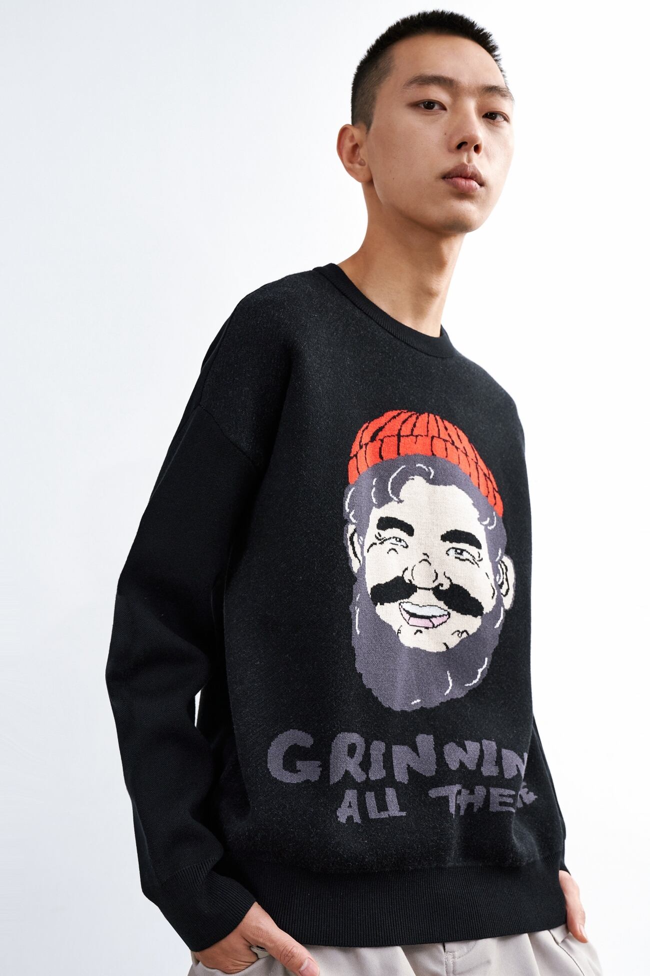 ヒップホップが好きなメンズにオススメ!個性的なパロディ柄が楽しい、ルーズフィットのセーター。シンプルにカーキ、ダークグレー、ブラックの3色展開。XSサイズからLサイズまで、大人っぽく上品に着こなせます。