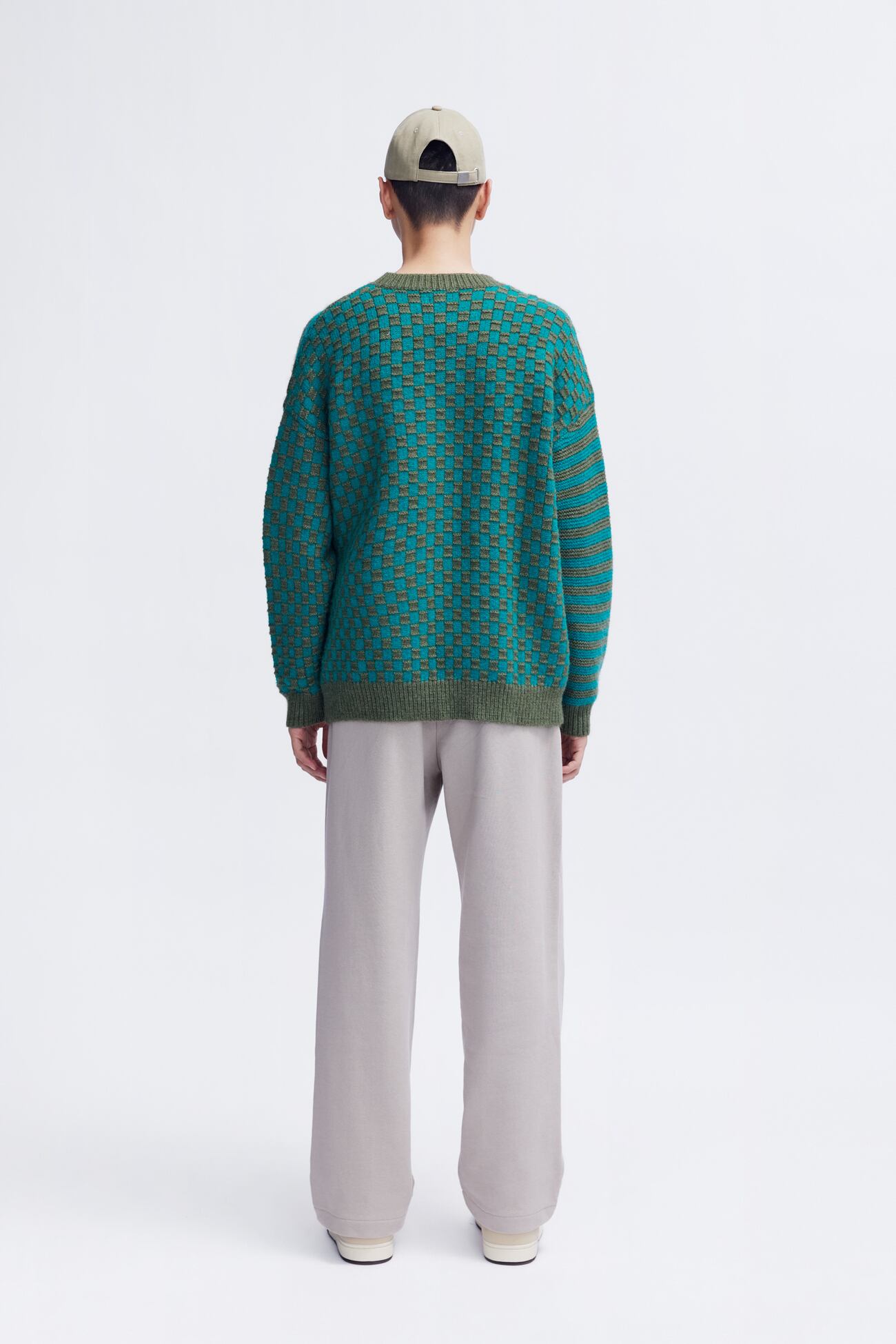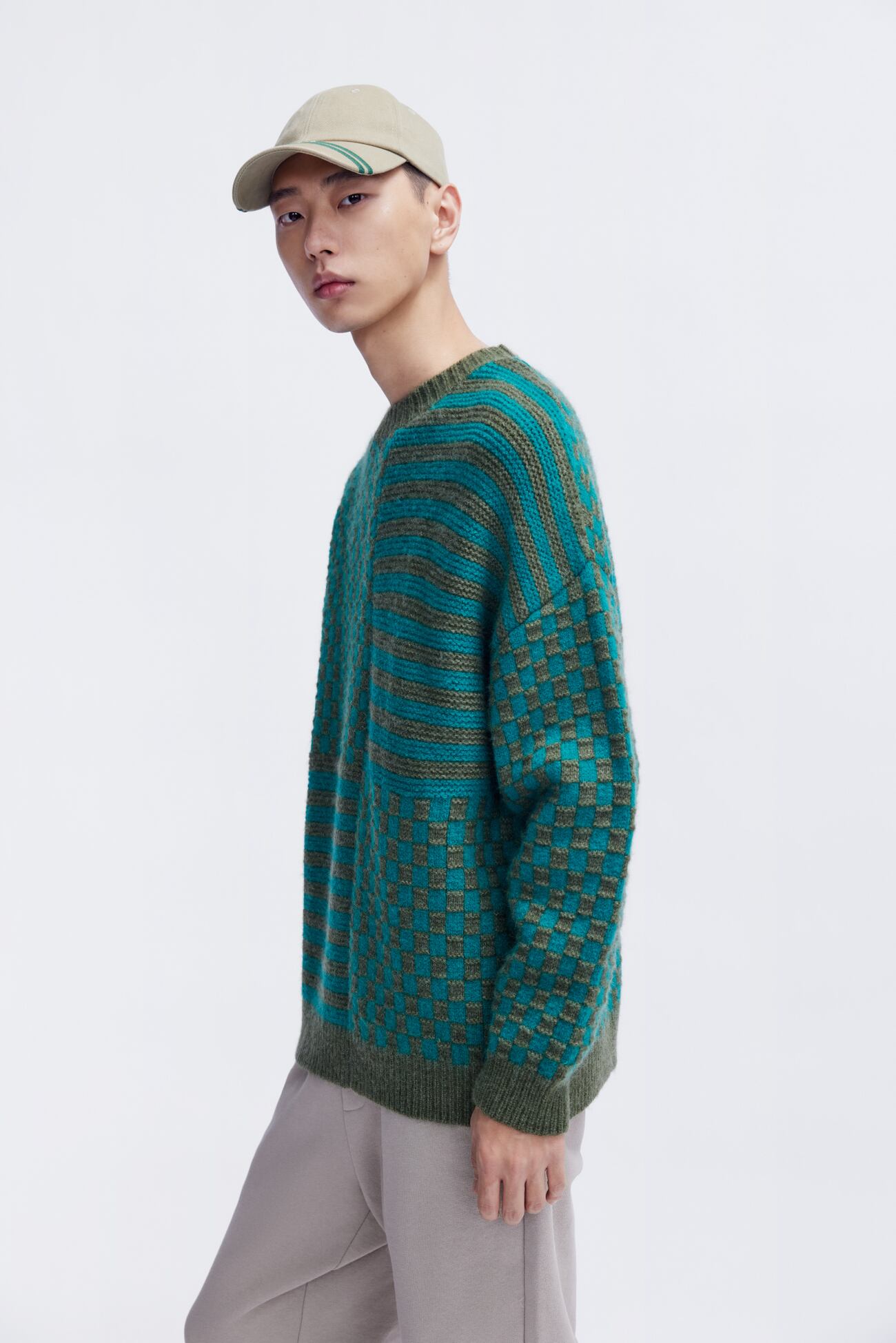 オリーブグリーンのチェック柄とストライプが絶妙なバランスを生む、冬にぴったりのカジュアルセーターが登場しました。男女問わず着こなせるシンプルで上品なデザインは、きれいめカジュアルからちょっとしたお出かけまで幅広く対応可能。