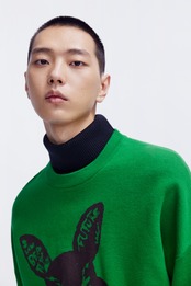 メンズにぴったりの、ラビット柄がキュートなセーターが登場しました。ゆったりとしたシルエットで着心地も抜群。厚手の編み地でしっかりとした温かさもあります。トレンド感のあるミディアムグリーンとレッドのカラーバリエーションで、普段のコーディネートに華やかさをプラス。スタイリッシュで大人っぽさのあるデザインなので、オフィスカジュアルから休日のお出かけまで幅広く着回せます。