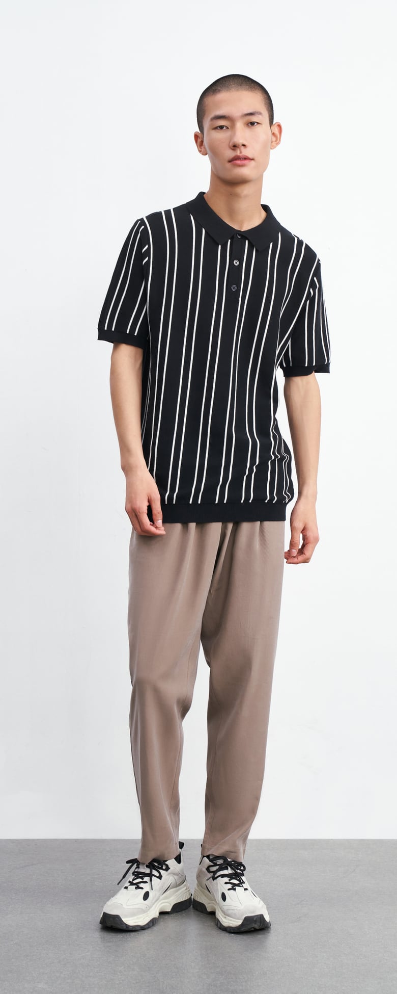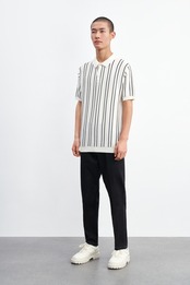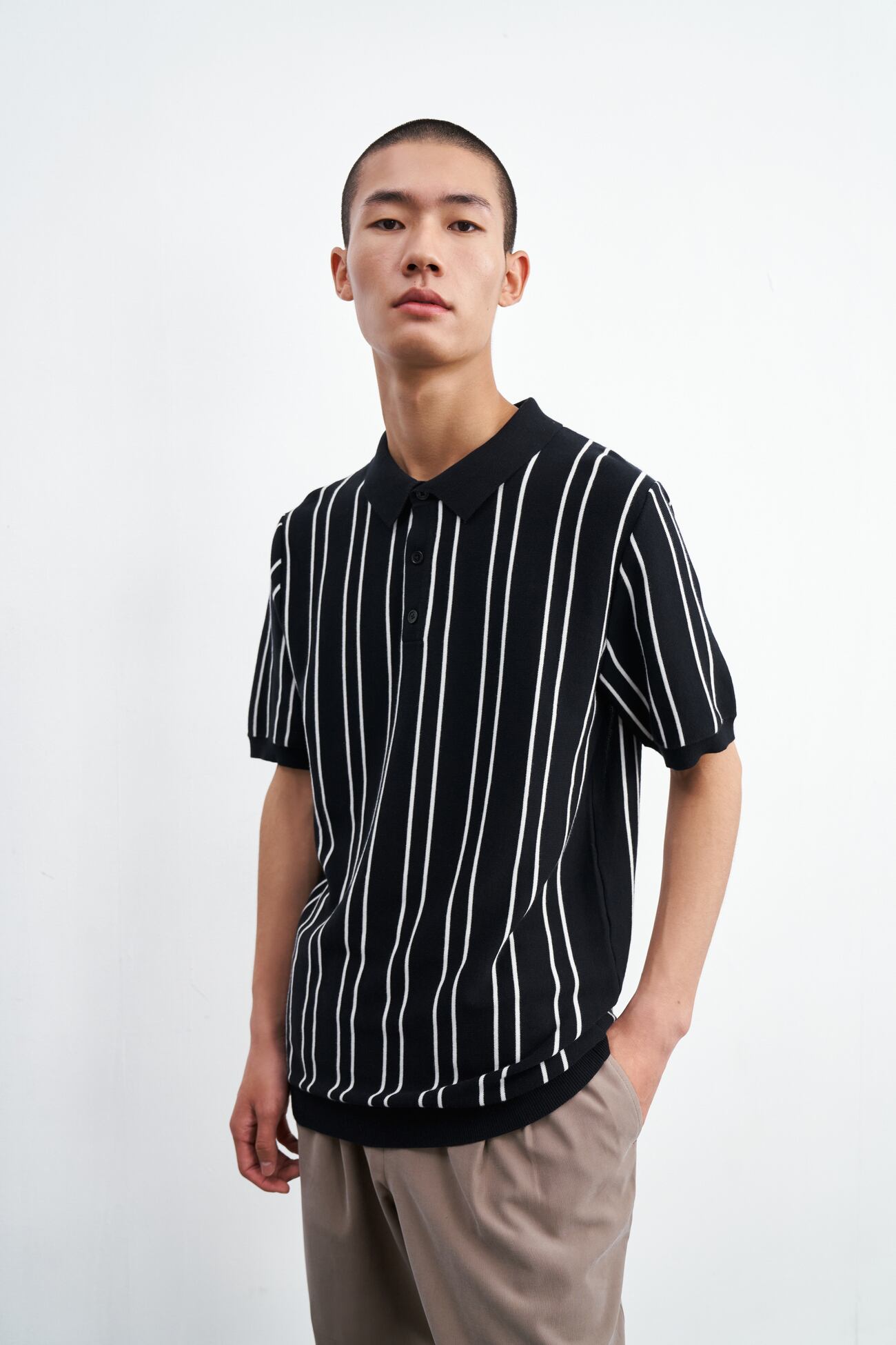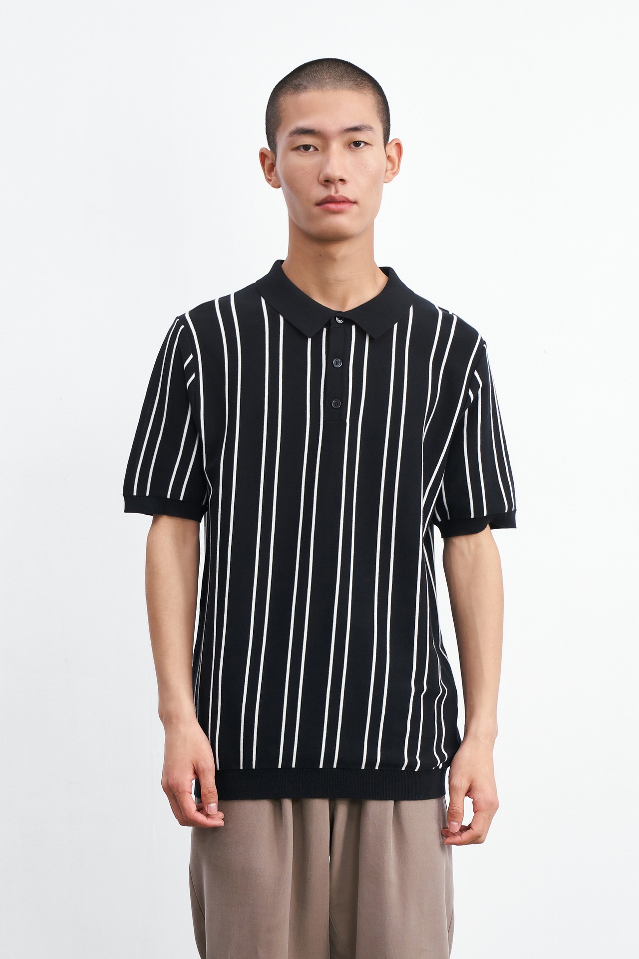 【春夏メンズファッション】コーデに取り入れやすいストライプ柄のポロシャツです。袖部分はリブ編みで仕上げ、カラープルオーバーともいえるデザイン。上品な黒と清涼感のあるホワイトの2カラー展開で、どんなシーンでも選びやすい一枚です。あなた好みのサイズがきっと見つかります。XSからXXLまでご用意しています。
