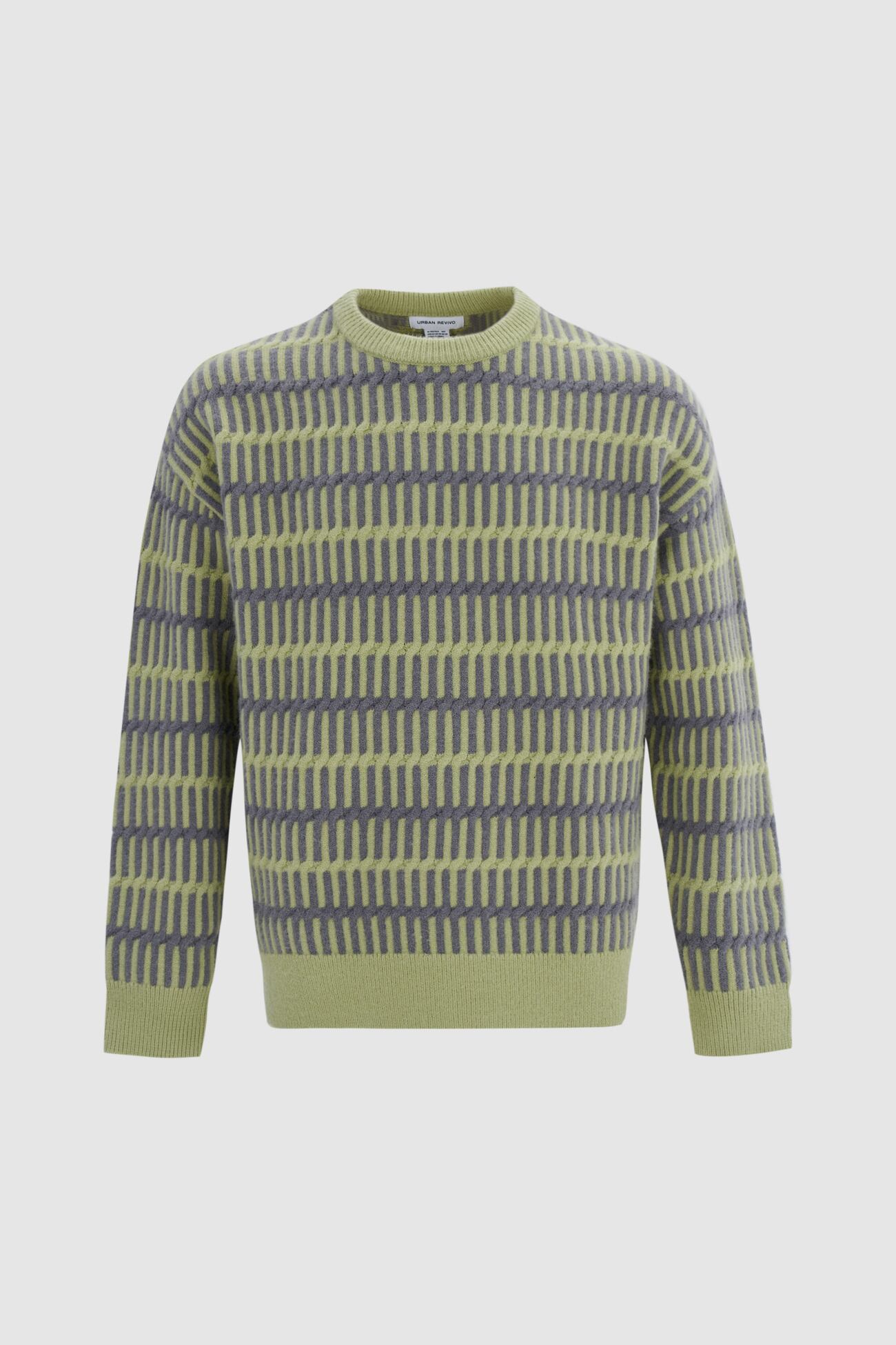 この冬のメンズファッションには、ストライプ柄のジャカード素材プルオーバーがおすすめです。清涼感のあるライトグリーンカラーが、季節感とおしゃれさを演出してくれます。ルーズなシルエットと袖丈が、リラックス感溢れるスタイルに仕上げます。このセーターは、クールで男らしい存在感も抜群です。