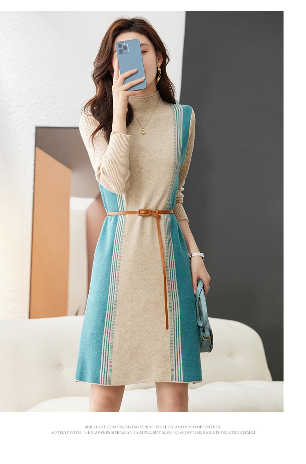 秋 冬 レディース ハーフハイカラー ボトムス Aライン ニット スカート カラーコントラスト ミドル丈 セーター ドレス ブルー ブラウン アプリコット M L XL XXL ワンピース 膝丈 ひざ丈 袖あり かわいい 大人可愛い きれいめ シンプル カジュアル 大人 上品 おしゃれ お洒落 大人可愛い 大人女子 キュート 存在感 春 秋 冬 10代 20代 30代 40代 レディース 女性用 女の子 オフィス 学生 通学 海 普段使い ファッション コーデ スタイル モテ トレンド インスタ映え