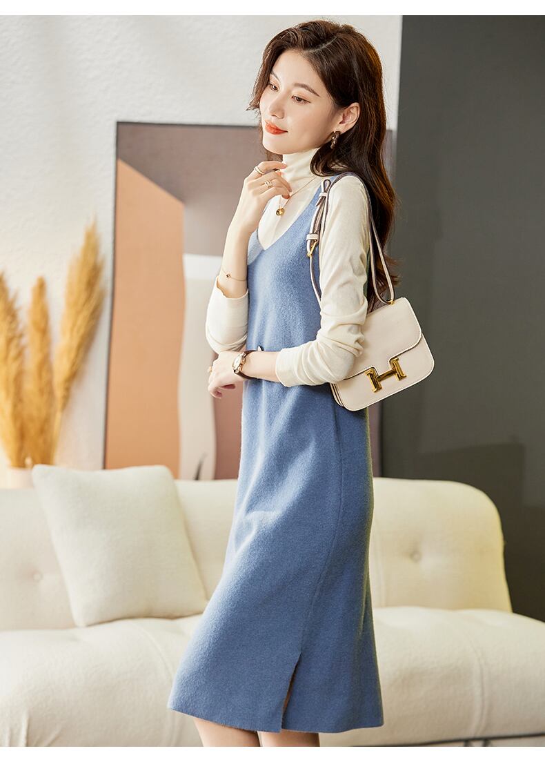 秋冬に欠かせないニット生地を使用し、プルオーバータイプで簡単にコーディネートできます。ハイネックとリブがアクセントになり、袖ありのミドル丈は膝上まで届き美脚効果が期待できます。