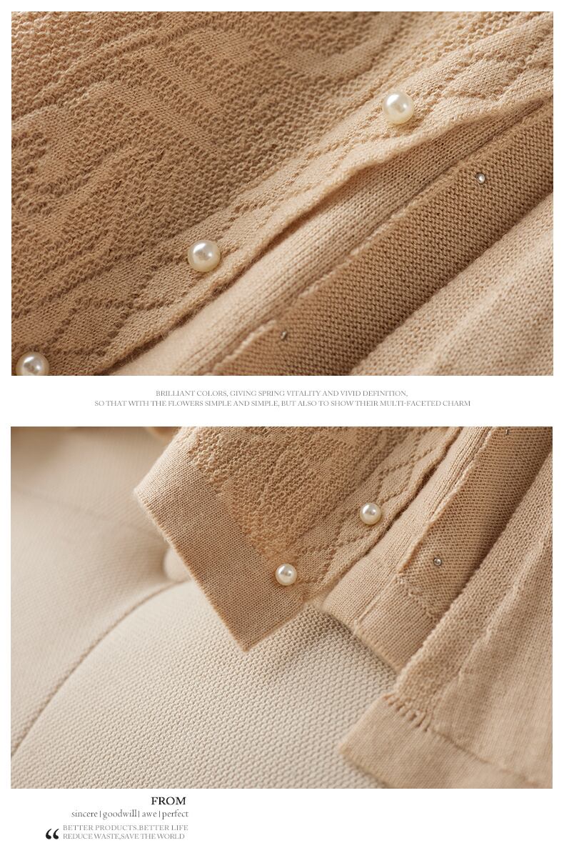 素材にもこだわりました。綿とポリウレタン混合生地でストレッチが効いた、暖かくて着心地の良いニット素材を使用しています。ビーズの付け方も手作業で一つ一つ縫い付けているので、高品質で長く愛用できる一枚に仕上がっています。