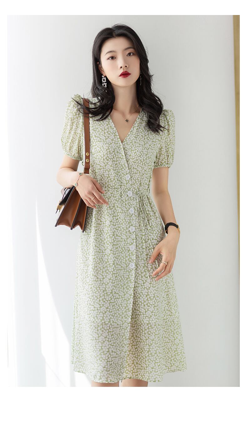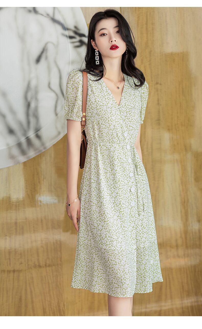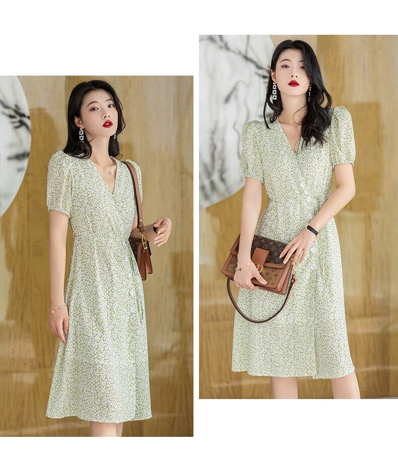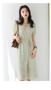 商品名:夏 V ネック シック パフスリーブ シフォン ドレス