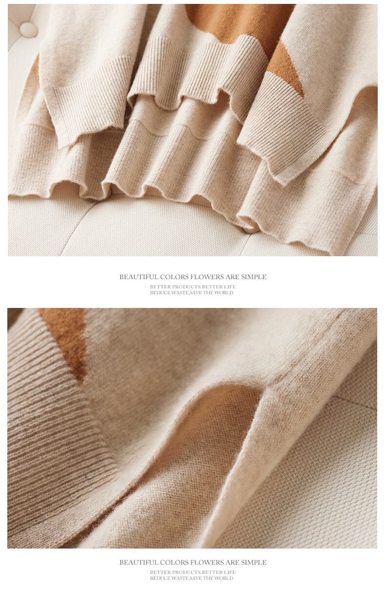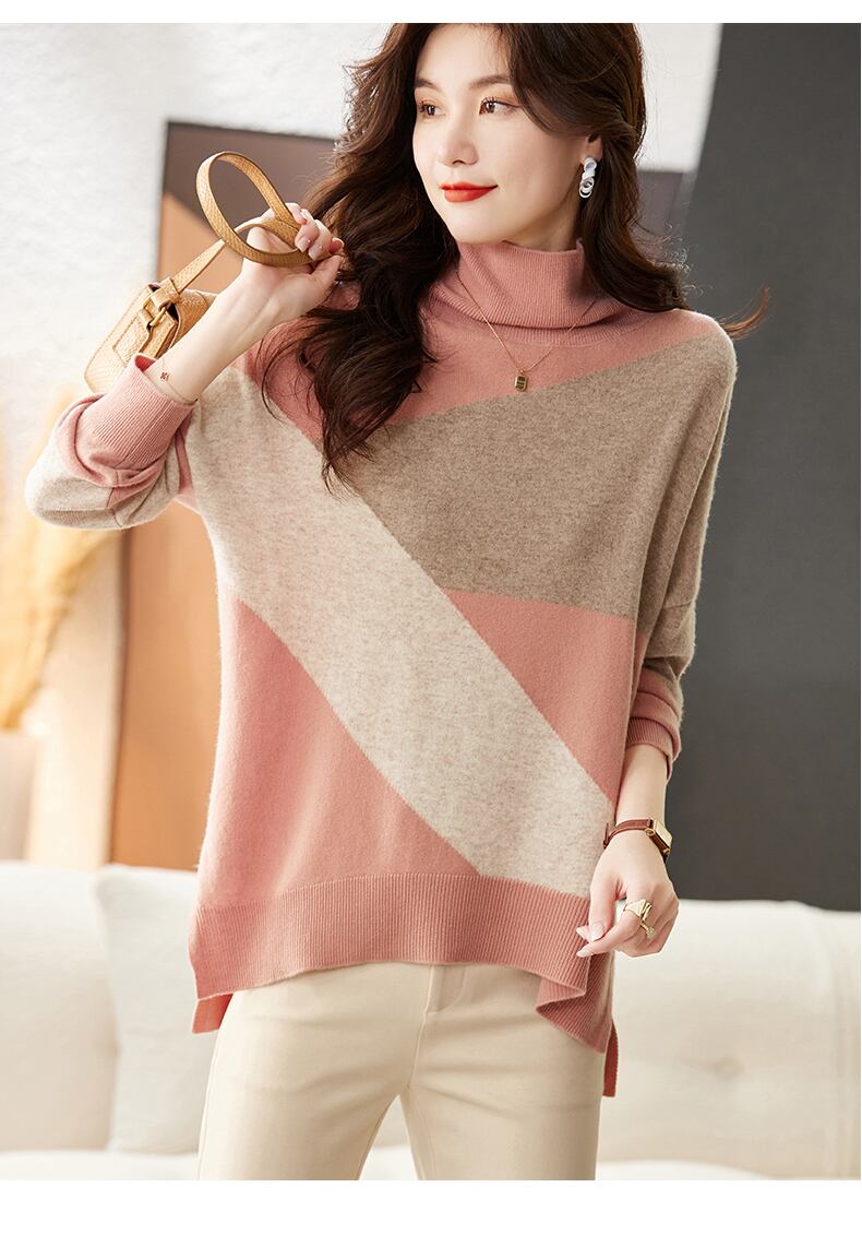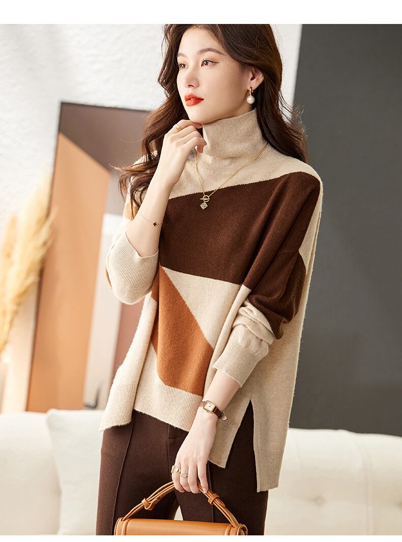 ハイネックのウールセーターが登場!カラーブロックのデザインがおしゃれなアイテムです。足首まできちんと覆ってくれるネックラインと、スリット入りの裾が大人の女性にぴったり。ブロックカラーの組み合わせが洗練された雰囲気を醸し出し、カラメル、ピンク、アプリコットの3色展開で、気分に合わせてコーディネートできます。