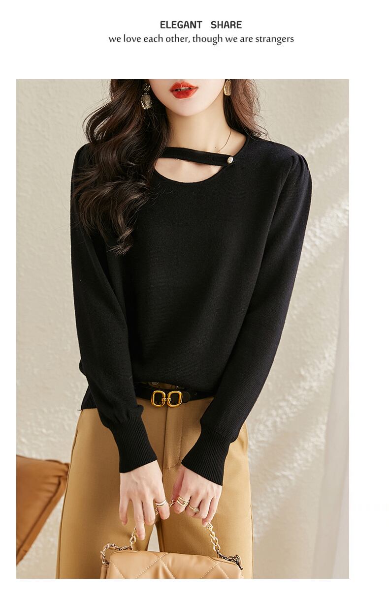 販促文:このブラックニットセーターは、女性の魅力を引き出し、より美しく輝かせるアイテムです。季節を問わず、カジュアルからきれいめまで様々なスタイルに合わせられるので、ワードローブに取り入れると着回し力が抜群です。色違いで揃えるのもおすすめです。さぁ、このセーターで新しい自分を見つけましょう。