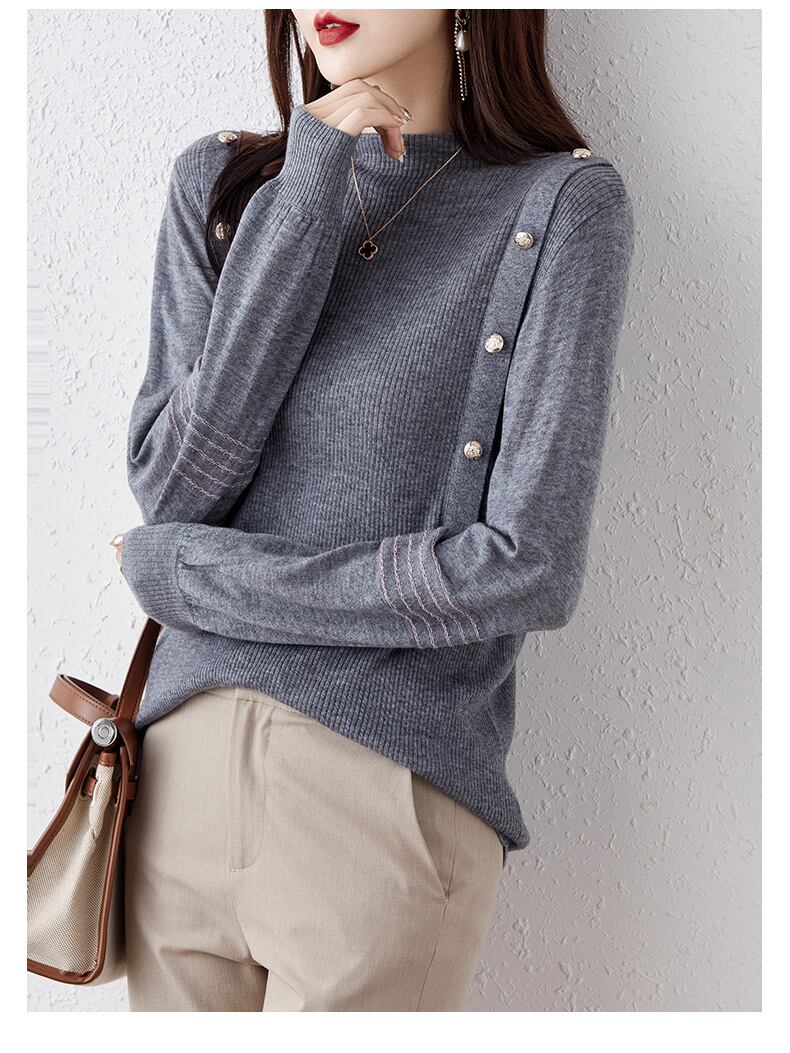 このセーターは、秋冬にぴったりのカジュアルなトップです。薄手の素材で、ハーフハイカラーや袖のデザインで上品さを演出し、大人可愛い雰囲気を醸し出しています。カラー展開も豊富で、グリーン、グレー、ネイビー、キャメル、サイズはM、L、XL、XXLまでご用意しています。季節を問わず、様々なシーンで着まわせるアイテムです。
