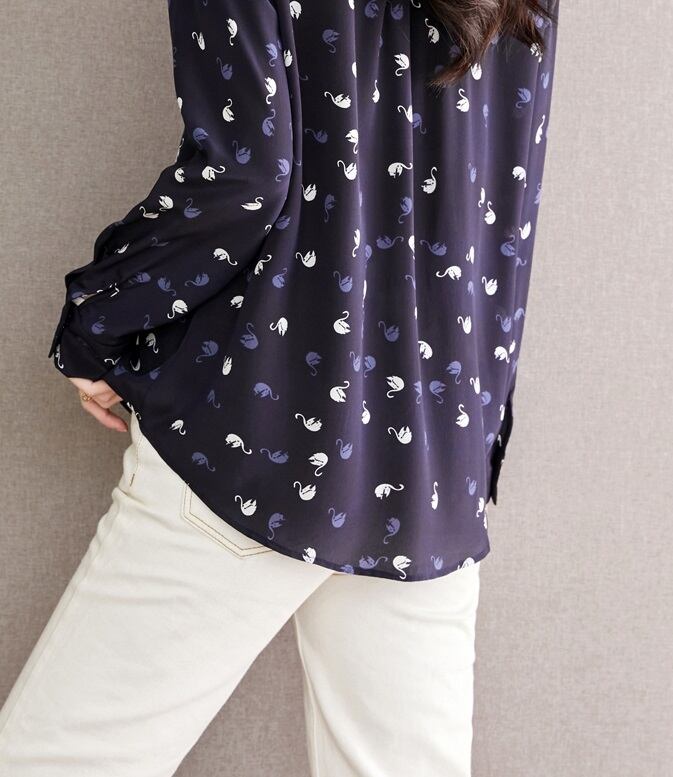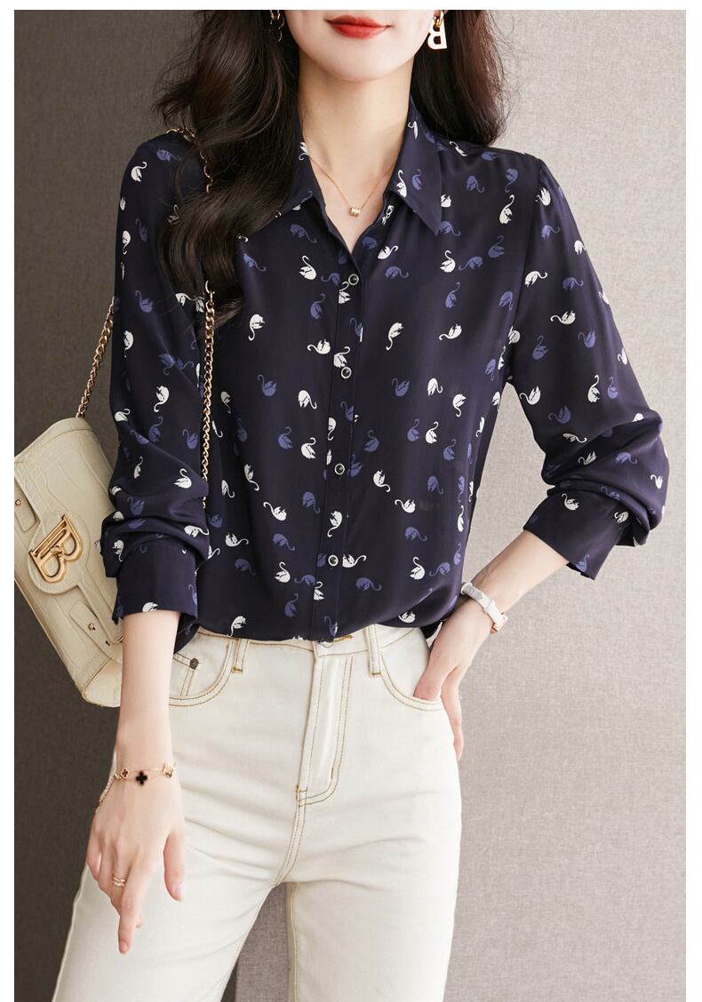 エレガントで上品な印象を与える秋のデザインシルクシャツ。ネイビーブルーの色味が、大人っぽいシックな雰囲気を醸し出しているトップスです。袖ありのデザインなので、きれいめスタイルはもちろん、カジュアルにも合わせやすいアイテムとなっております。