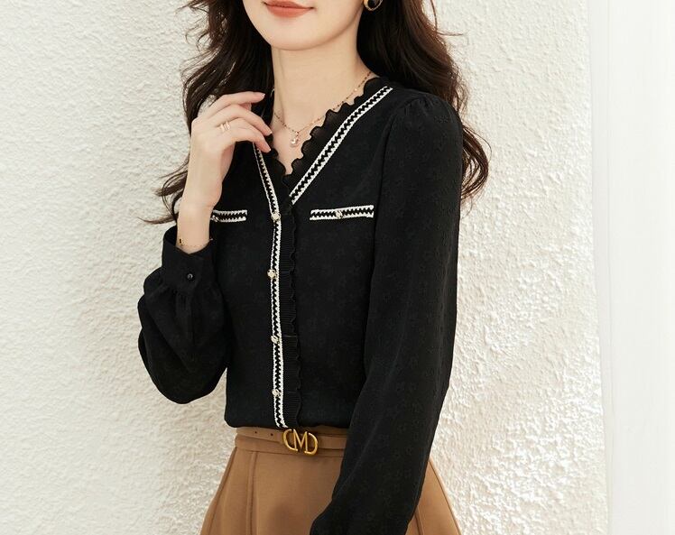 黒 エレガント V ネック シフォンシャツ 秋 女性 フレンチスタイル ショートトップ ブラック ベージュ M L XL XXL トップス 袖あり かわいい 大人可愛い きれいめ シンプル カジュアル 大人 上品 おしゃれ お洒落 大人可愛い 大人女子 キュート 春 夏 秋 10代 20代 30代 レディース 女性用 女の子 通勤 学生 通学 デート お出かけ 女子会 お泊まり 休日 パーティー イベント 旅行 普段使い ファッション コーデ スタイル インスタ映え 色展開