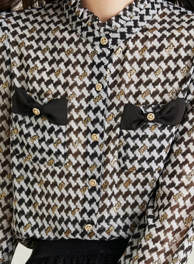 千鳥格子とちょう結びが女性らしさを演出するエレガントなシフォンシャツ。シンプルかつ上品なデザインで、オールマッチなのはもちろん、カジュアルからフォーマルまで幅広いシーンで活躍します。袖のデザインが加わり、季節感も出せる一枚です。