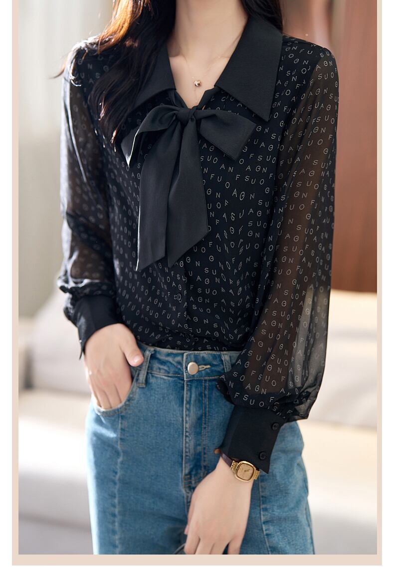 洋風 個性的なデザイン エレガント 文字印刷柄 シャツ ちょう結び 黒 シフォン 秋 シャツ 女性 ブラック M L XL XXL トップス 袖あり かわいい 大人可愛い きれいめ シンプル カジュアル 大人 上品 おしゃれ お洒落 大人可愛い 大人女子 キュート 春 夏 秋 10代 20代 30代 レディース 女性用 女の子 通勤 学生 通学 デート お出かけ 女子会 お泊まり 休日 パーティー イベント 旅行 普段使い ファッション コーデ スタイル インスタ映え | ameiro18