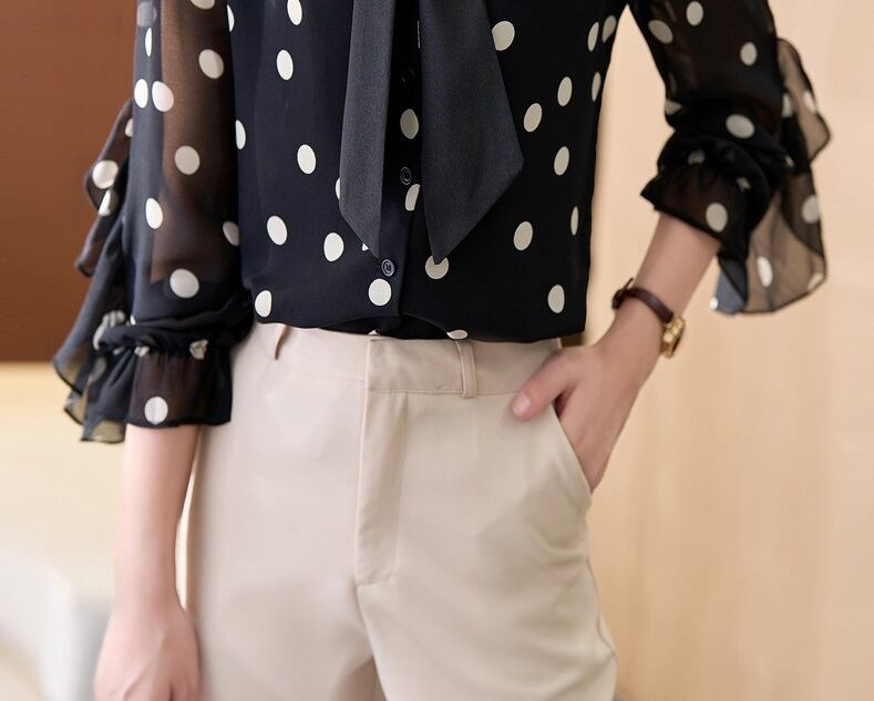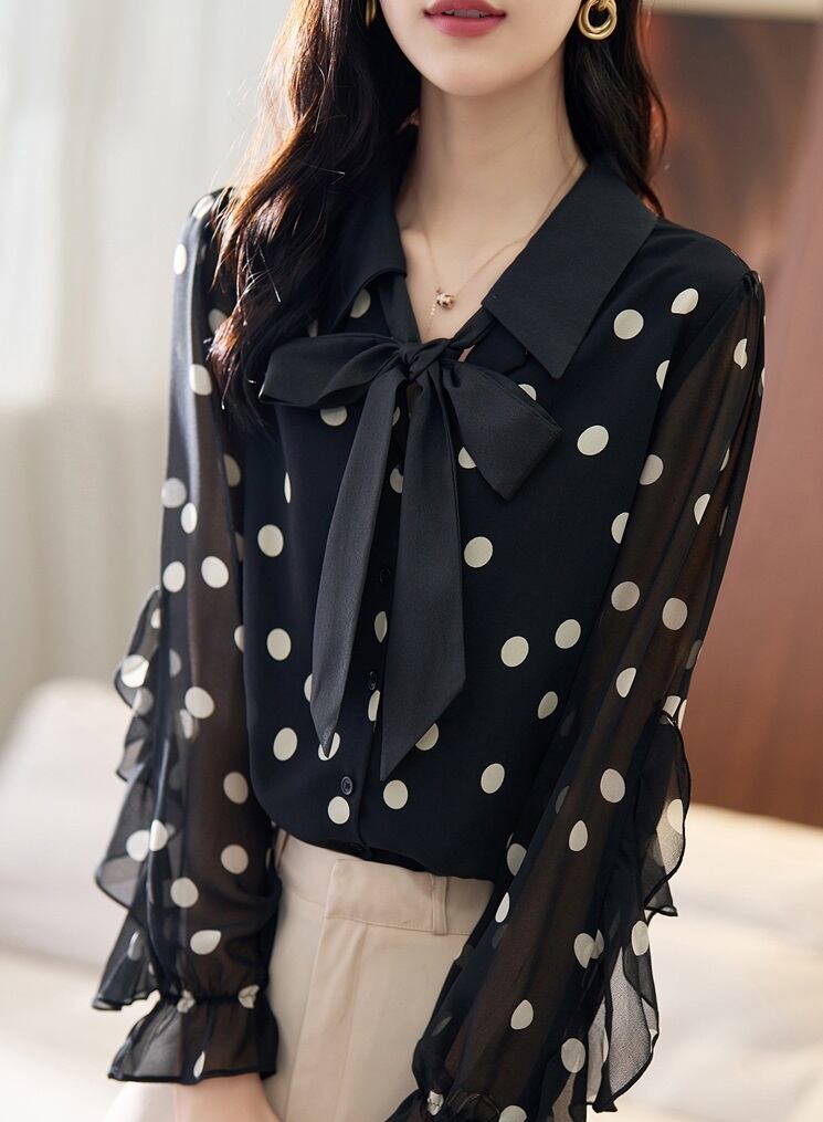クラシック オールマッチ 個性的なデザイン ポルカドット 秋 ちょう結び ドレープ付き フリル シフォンシャツ ブラック M L XL XXL トップス 袖あり かわいい 大人可愛い きれいめ シンプル カジュアル 大人 上品 おしゃれ お洒落 大人可愛い 大人女子 キュート 春 夏 秋 10代 20代 30代 レディース 女性用 女の子 通勤 学生 通学 デート お出かけ 女子会 お泊まり 休日 パーティー イベント 旅行 普段使い ファッション コーデ スタイル インスタ映え | ameiro18