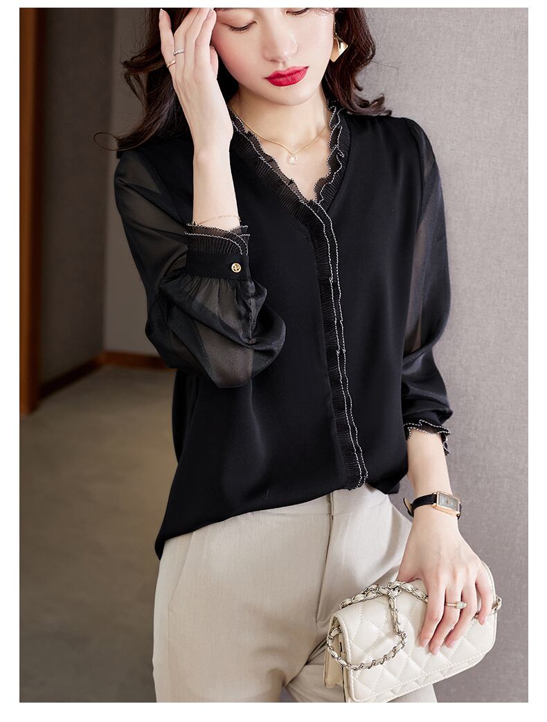 このエレガントなVネックシフォンシャツは、大人可愛い女性のためのアイテムです。淡い白やアプリコット、深みのあるブラックの3色展開で、様々なシーンに合わせてお楽しみいただけます。