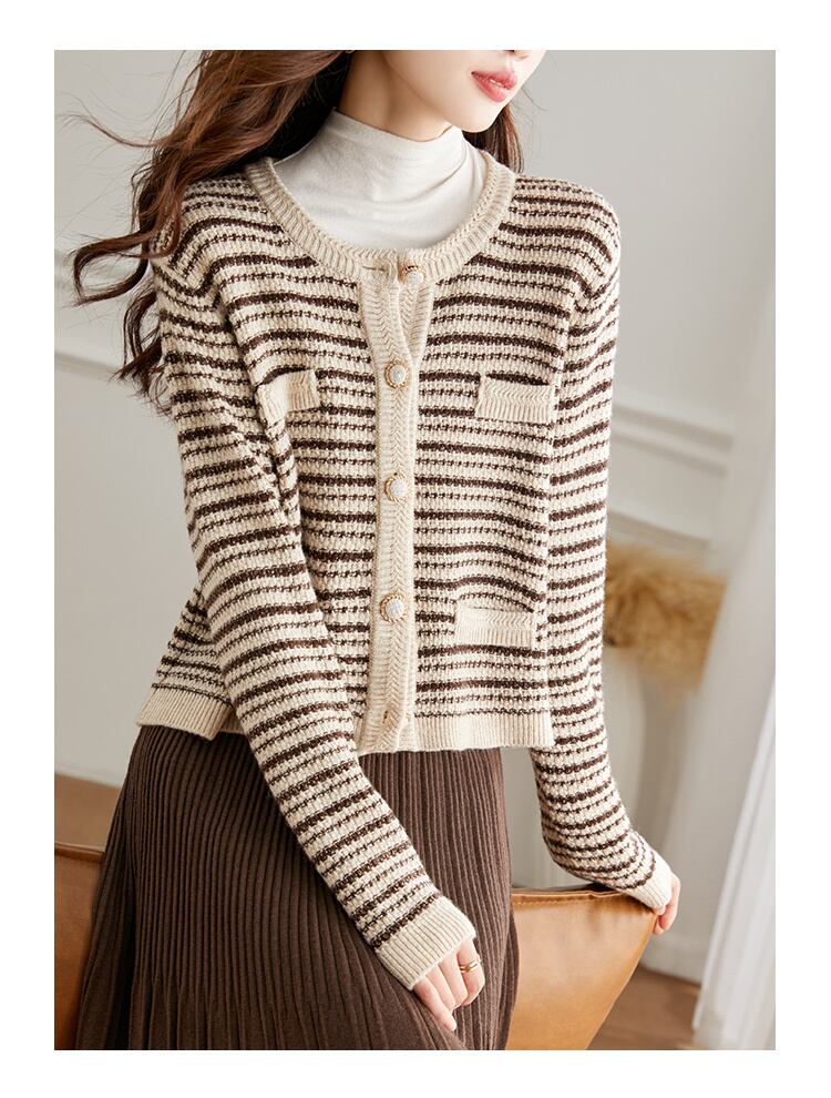 ストライプ ウール ニット カーディガン 女性 秋 冬 ライン ショート セーター ジャケット ブラウン M L トップス 袖あり かわいい 大人可愛い きれいめ シンプル カジュアル 大人 上品 おしゃれ お洒落 大人可愛い 大人女子 キュート 春 夏 秋 10代 20代 30代 レディース 女性用 女の子 通勤 学生 通学 デート お出かけ 女子会 お泊まり 休日 パーティー イベント 旅行 普段使い ファッション コーデ スタイル インスタ映え
