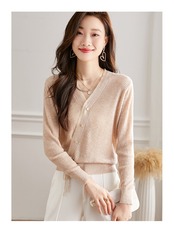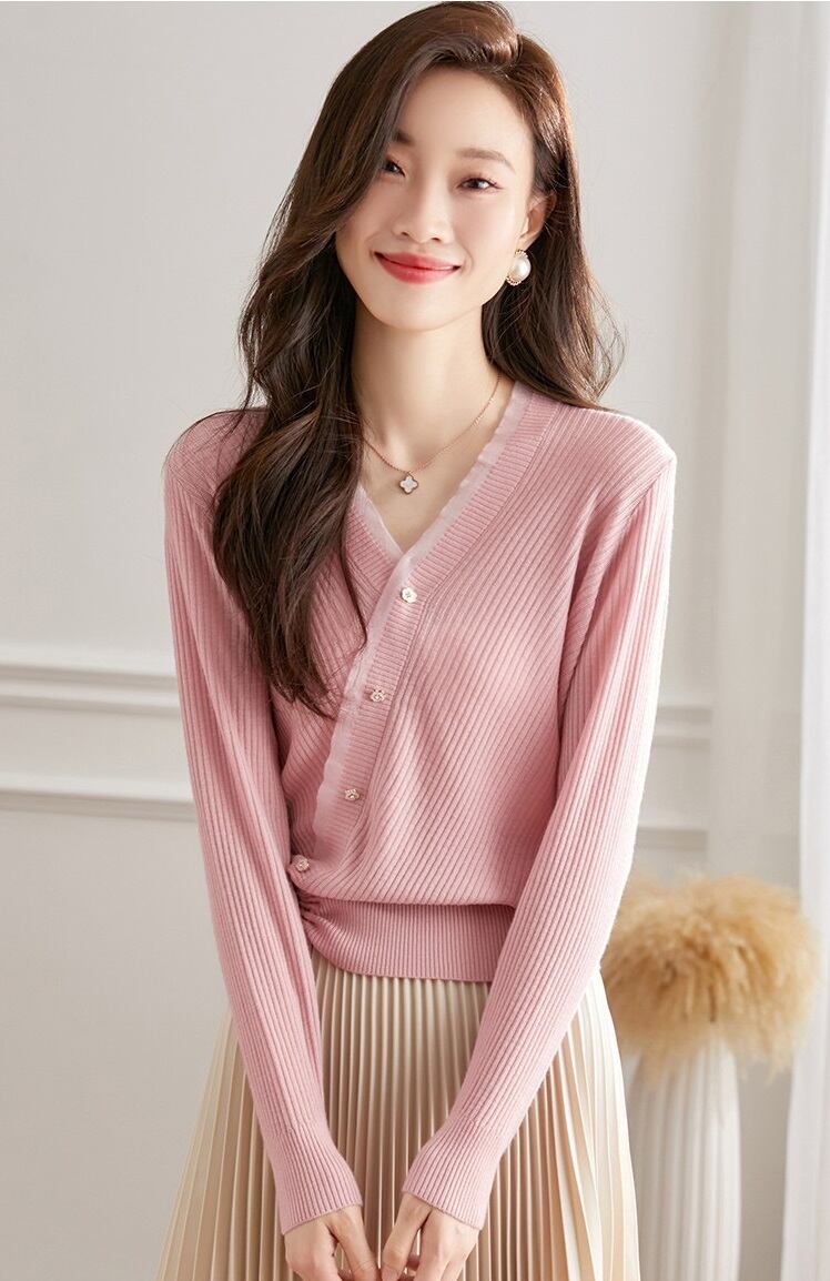 オシャレで上品な秋のデザインセンスを楽しむなら、このニットセーターがおすすめです。Vネックで女性らしい首元を演出し、薄手の素材で春や秋にぴったりな一枚です。ショート丈でウエストをすっきりと見せる効果もあり、カジュアルからきれいめまで幅広いスタイルに対応しています。