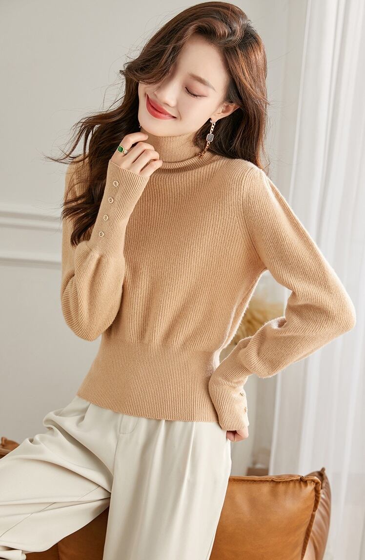 おしゃれ度アップ間違いなしのハイネックウールセーター。ハイウエストデザインとゆったりしたシルエットが大人可愛い雰囲気を演出します。キャメルとブラックの2色展開で、シンプルながらも上品さを兼ね備えたデザイン。秋冬のスタイリングにぴったりのアイテムです。