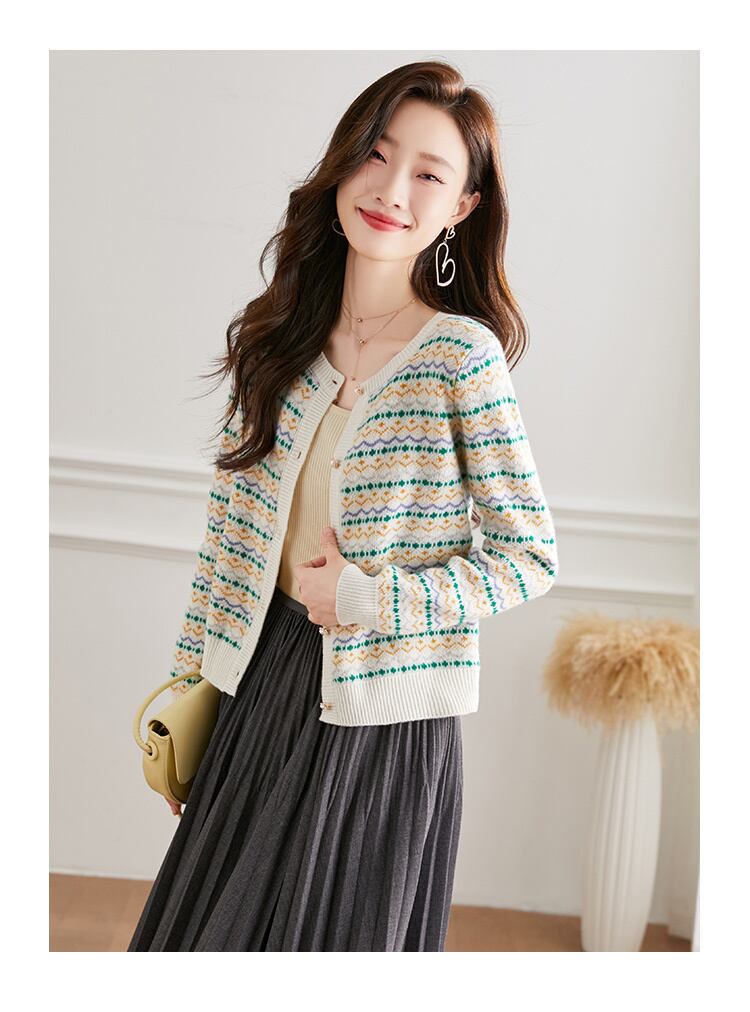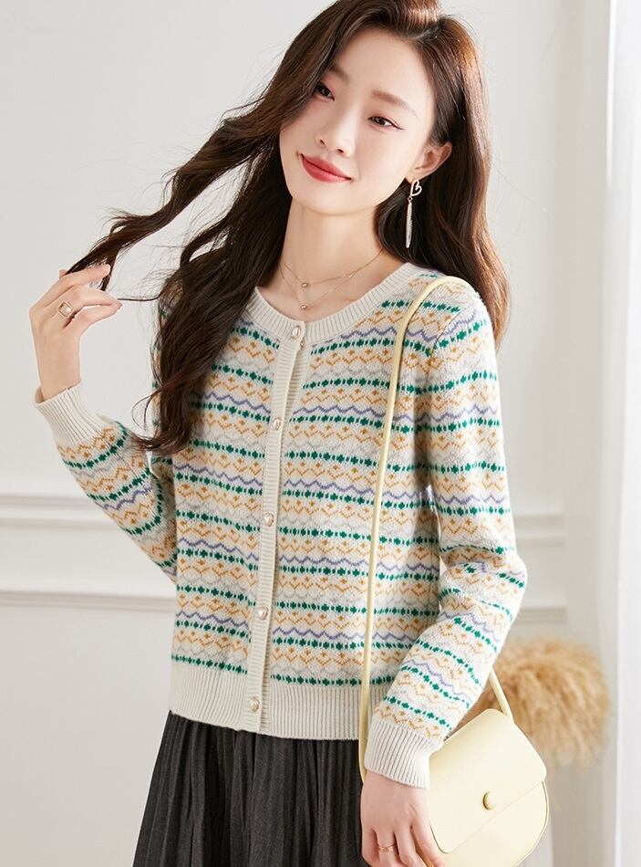 ピュア ウール ニット カーディガン レディース 秋 パール バックル ストライプ ジャカード ショート スタイル 薄手 セーター ジャケット付き ホワイト M L XL トップス 袖あり かわいい 大人可愛い きれいめ シンプル カジュアル 大人 上品 おしゃれ お洒落 大人可愛い 大人女子 キュート 春 夏 秋 10代 20代 30代 レディース 女性用 女の子 通勤 学生 通学 デート お出かけ 女子会 お泊まり 休日 パーティー イベント 旅行 普段使い ファッション インスタ映え | ameiro18