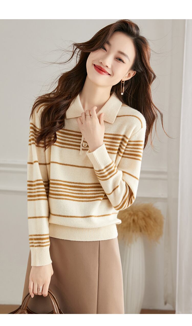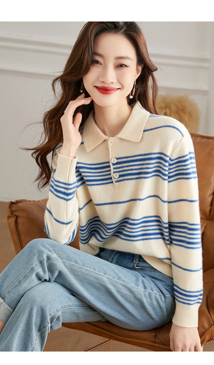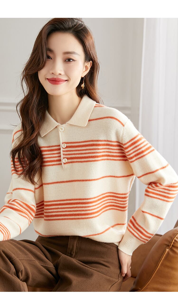 ポロ ラペル ストライプ ウール セーター 女性 秋 冬 ショート セーター ニット トップ ブルー オレンジ ブラウン M L トップス 袖あり かわいい 大人可愛い きれいめ シンプル カジュアル 大人 上品 おしゃれ お洒落 大人可愛い 大人女子 キュート 春 夏 秋 10代 20代 30代 レディース 女性用 女の子 通勤 学生 通学 デート お出かけ 女子会 お泊まり 休日 パーティー イベント 旅行 普段使い ファッション コーデ スタイル インスタ映え 色展開