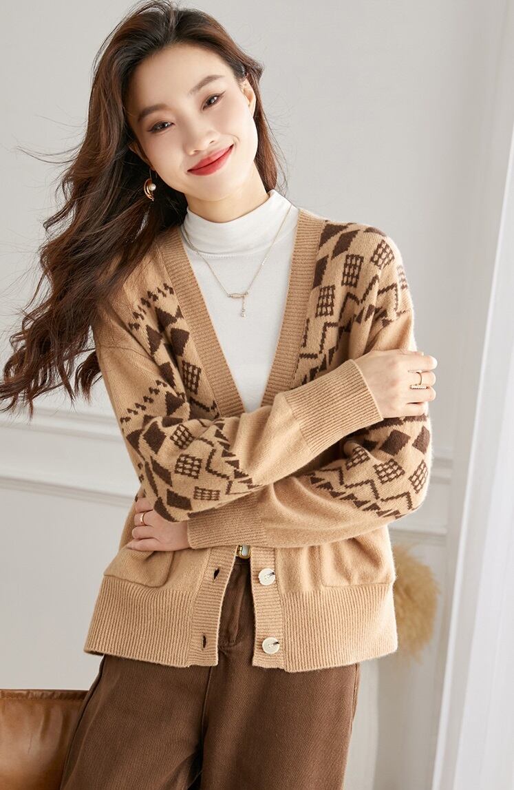 ピュア ウール ジャカード セーター コート 女性 秋 冬 ショート セクション ニット カーディガン キャメル ホワイト パープル M L トップス 袖あり かわいい 大人可愛い きれいめ シンプル カジュアル 大人 上品 おしゃれ お洒落 大人可愛い 大人女子 キュート 春 夏 秋 10代 20代 30代 レディース 女性用 女の子 通勤 学生 通学 デート お出かけ 女子会 お泊まり 休日 パーティー イベント 旅行 普段使い ファッション コーデ スタイル インスタ映え 色展開