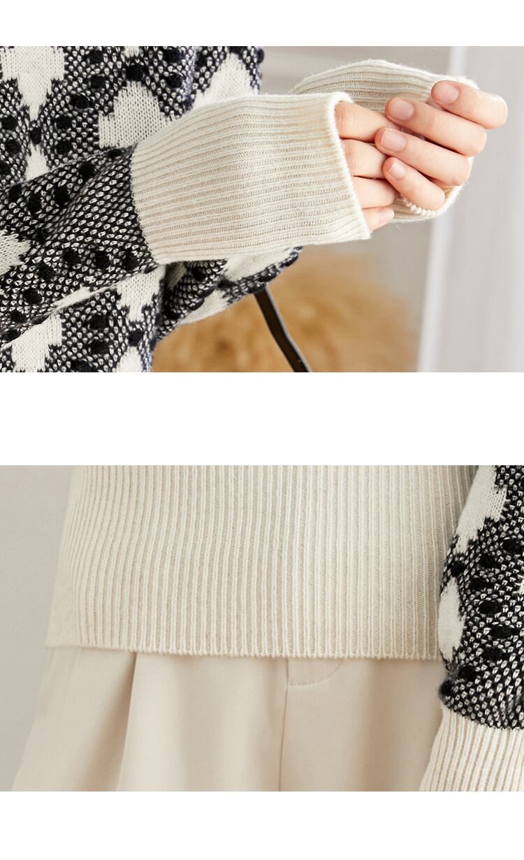 このジャカード ウール セーターで、オシャレで快適な秋冬をお楽しみください。是非、あなたのワードローブに加えてみてくださいね。