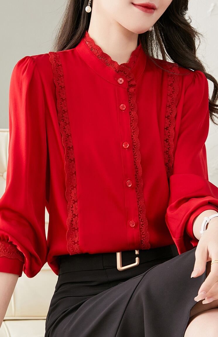 エレガント 個性的なデザイン ヘビーシルク シャツ 女性 春 秋 レース エッジ スタンドカラー 長袖 シルク トップ ベージュ レッド S M L トップス 袖あり かわいい 大人可愛い きれいめ シンプル カジュアル 大人 上品 おしゃれ お洒落 大人可愛い 大人女子 キュート 春 夏 秋 10代 20代 30代 レディース 女性用 女の子 通勤 学生 通学 デート お出かけ 女子会 お泊まり 休日 パーティー イベント 旅行 普段使い ファッション コーデ スタイル インスタ映え 色展開