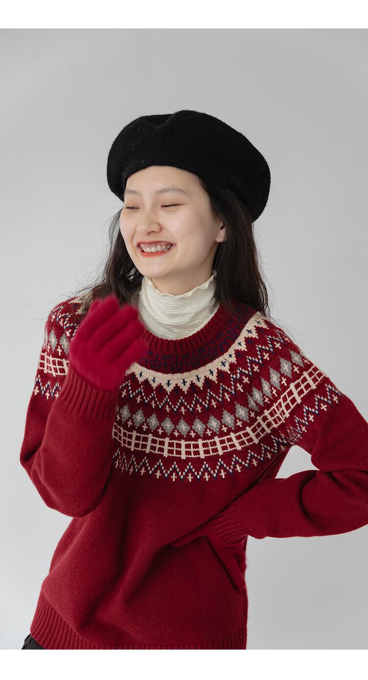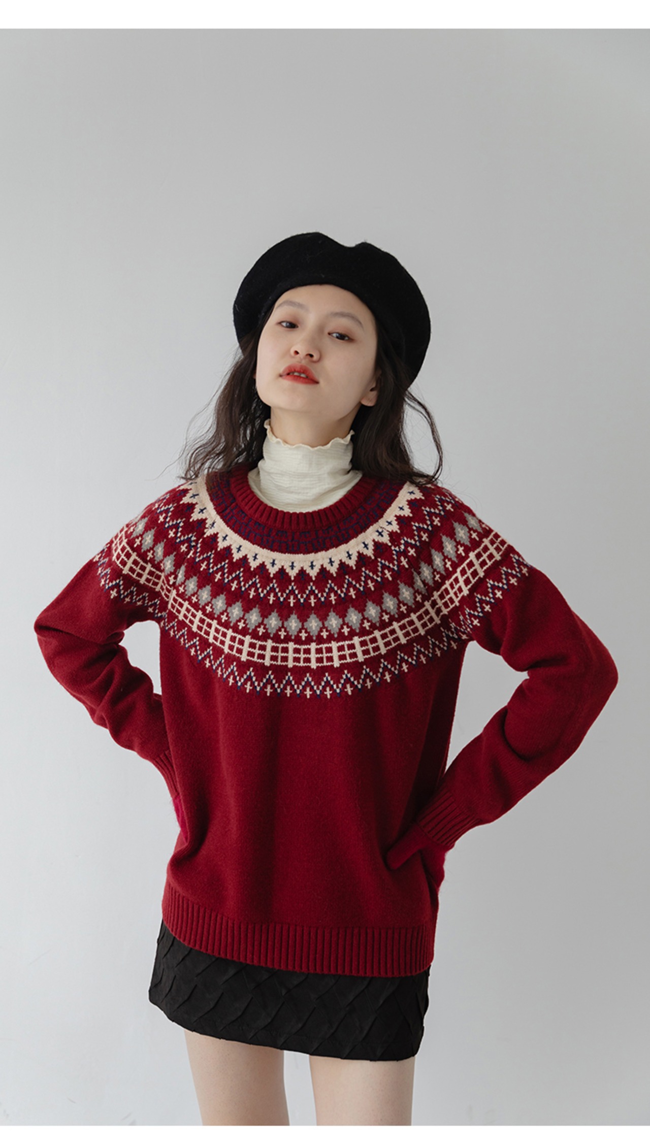 レトロな雰囲気漂うラウンドネックのプルオーバーセーターが登場しました。どんなファッションにも合わせやすいブラウンやレッドといったカラーバリエーションで、大人っぽい可愛さを演出します。フリーサイズの設計なので、どんな体型の方にもピッタリな着心地です。袖ありでシンプルなデザインながら、上品さも兼ね備えた一着です。