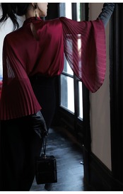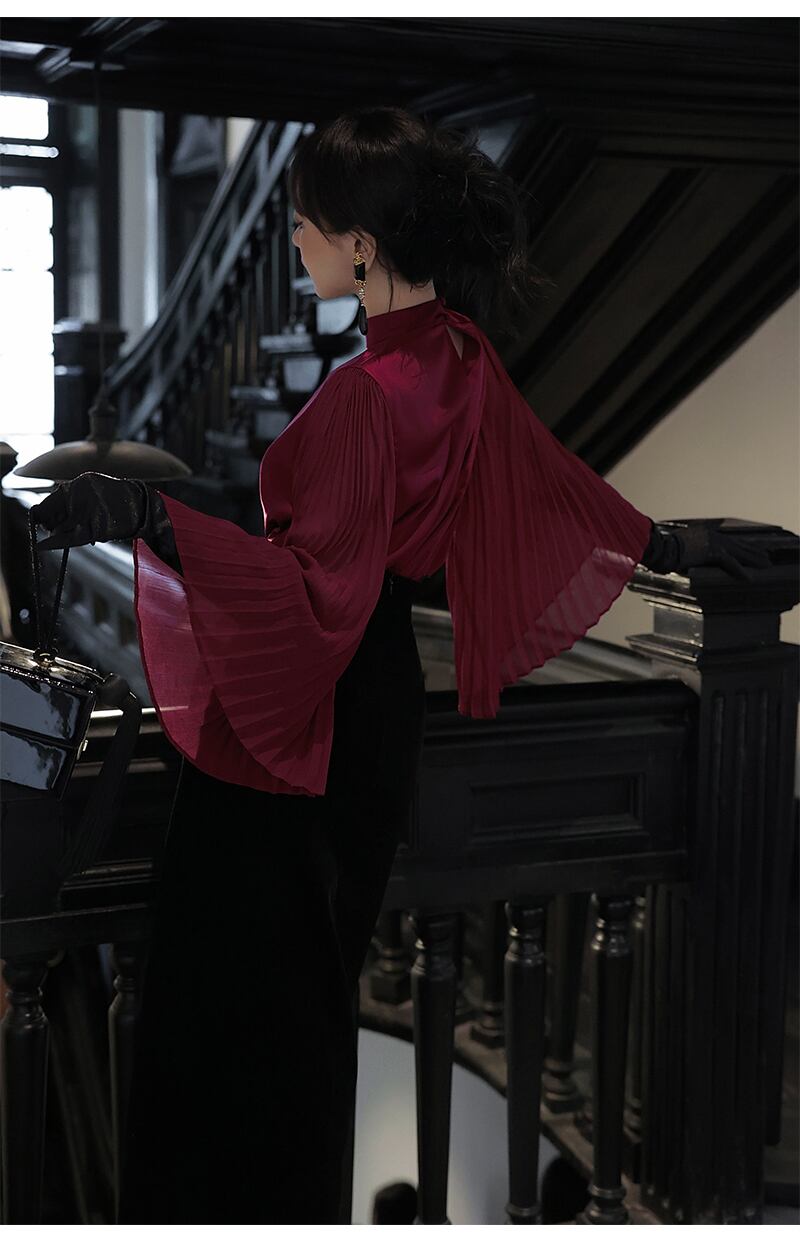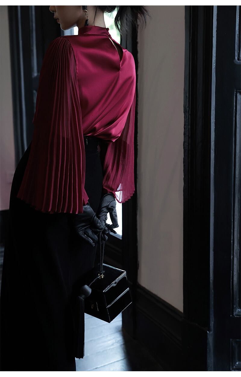 このシャツは、シンプルでありながらも女性らしいデザインが特徴です。自然な落ち感のあるシルク素材が肌触りよく、着心地も抜群。レッドカラーが華やかさを演出し、どんなコーディネートにも合わせやすい一枚です。