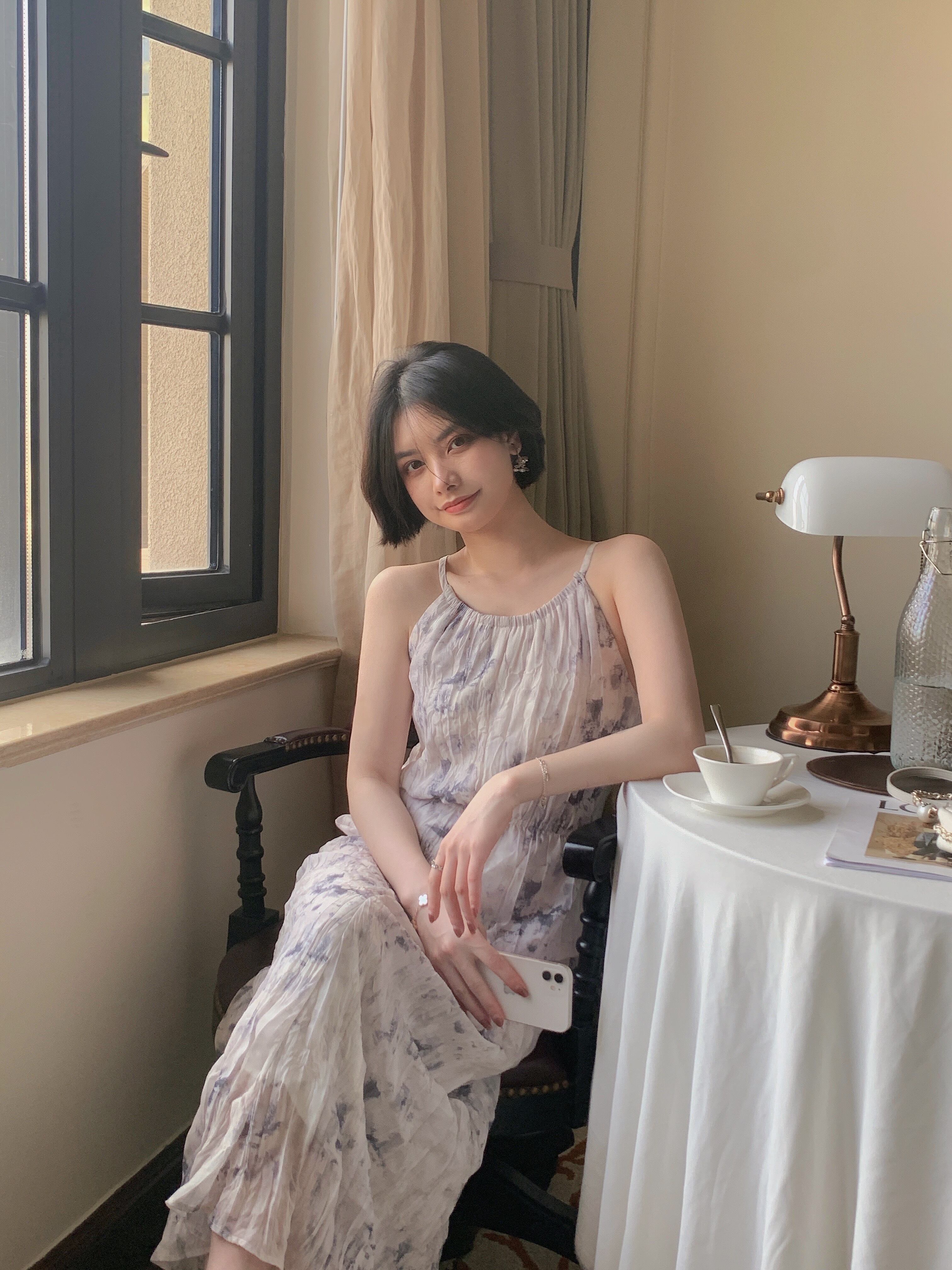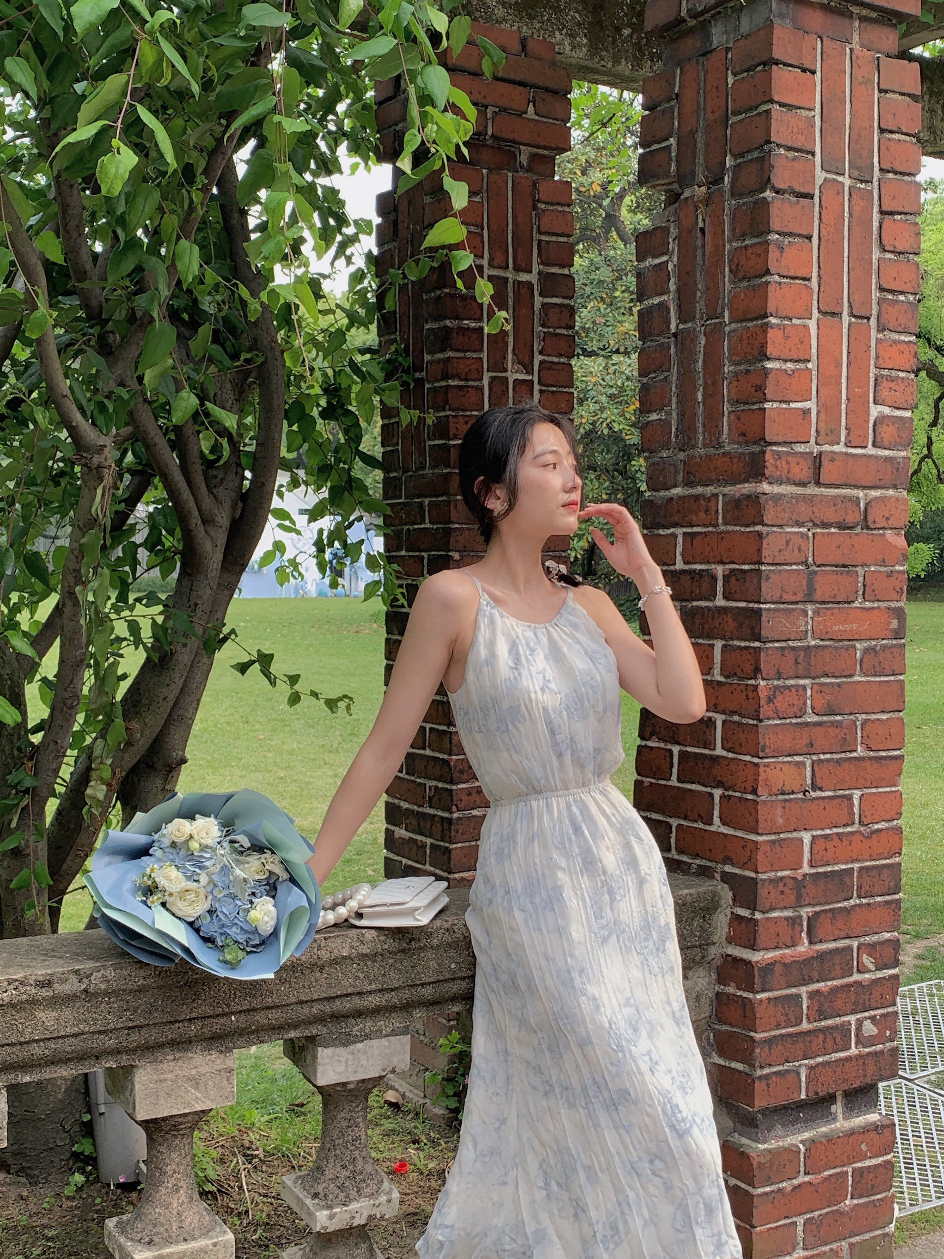 プリント ホルターネック ドレス 女性 夏 ウエスト ハイエンド ノースリーブ サスペンダー ドレス ブルー ブラウン S M L ワンピース 膝丈 ひざ丈 袖あり 5分袖 かわいい 大人可愛い きれいめ シンプル カジュアル 大人 上品 おしゃれ お洒落 大人可愛い 大人女子 春 夏 秋 10代 20代 30代 40代 レディース 女性用 女の子 学生 通学 デート お出かけ 女子会 お泊まり 休日 パーティー イベント 旅行 普段使い ファッション コーデ スタイル トレンド 流行 インスタ映え