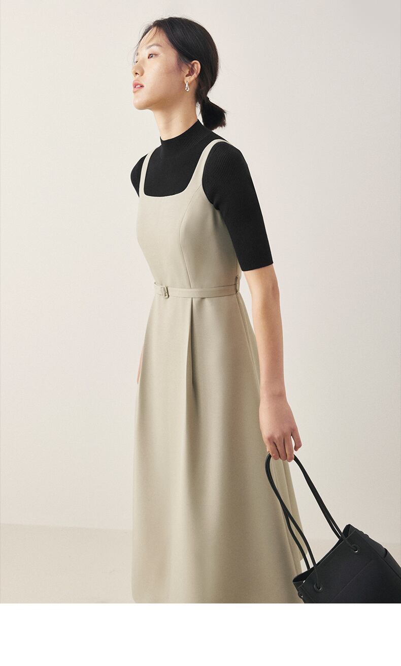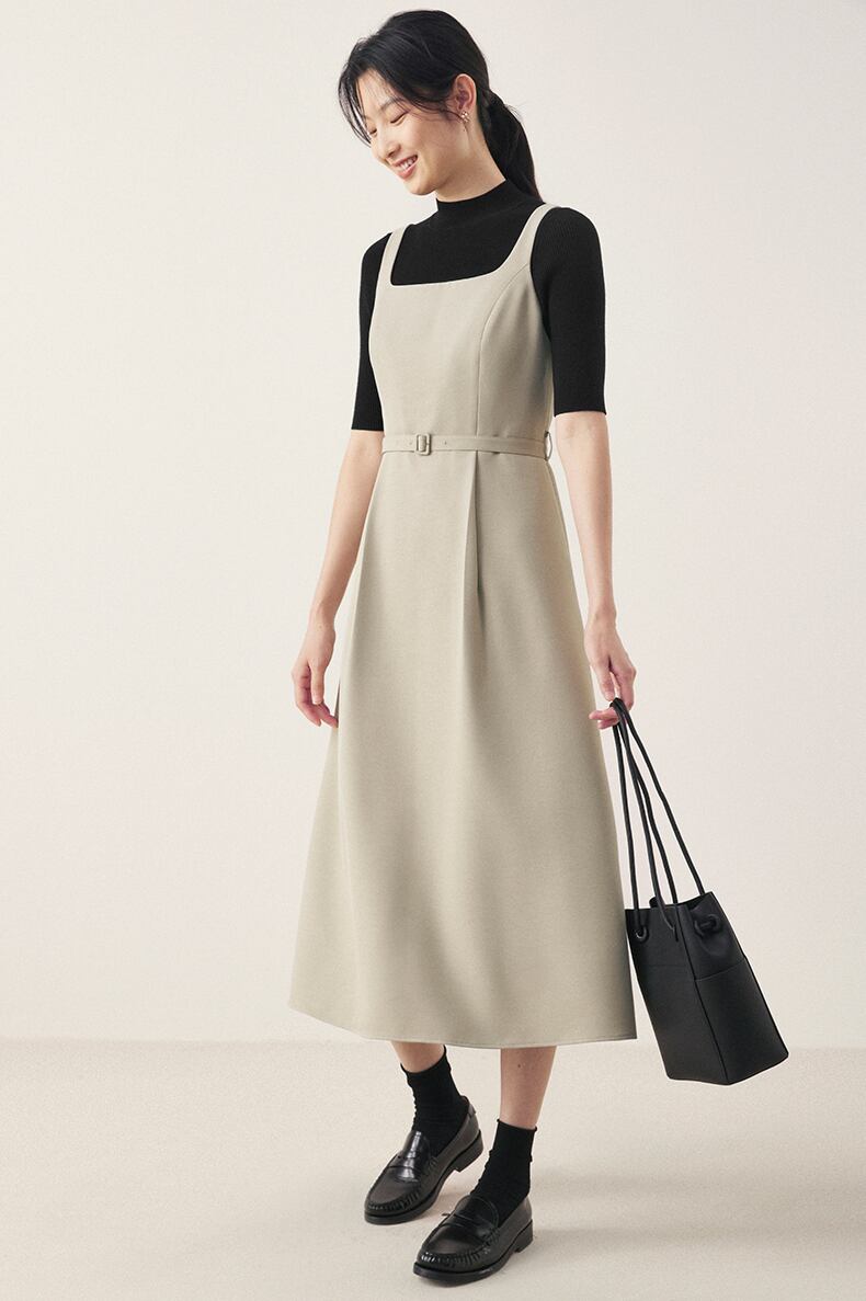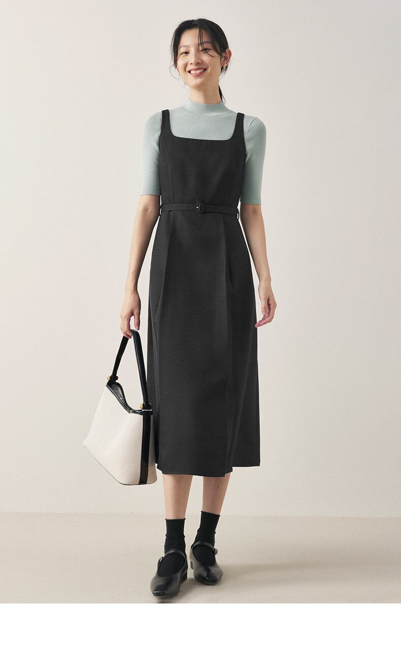 シンプルでありながらも上品さを感じさせるスクエアカラーのノースリーブドレス。カーキとブラックの2色展開で、秋冬のカジュアルスタイルにぴったりです。女性らしいウエストラインを強調するデザインで、かわいらしさと大人っぽさを兼ね備えた一枚です。