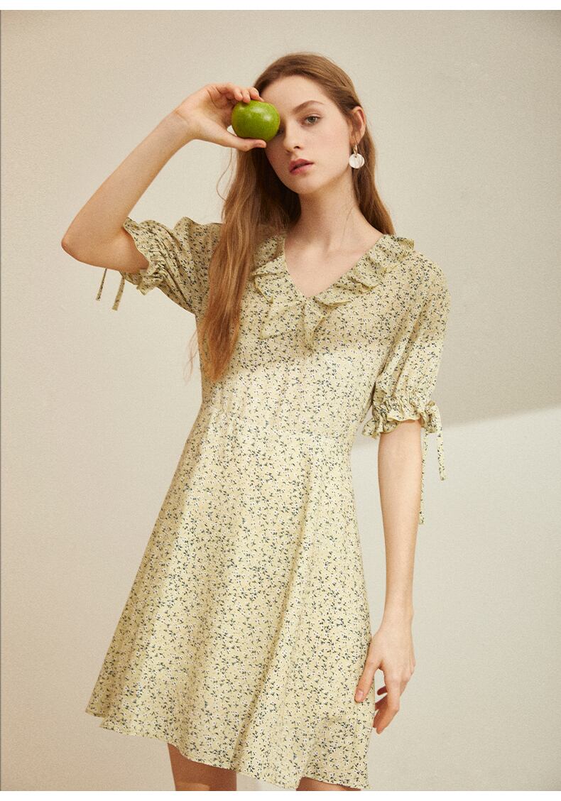 このエレガントでカジュアルな花柄ドレスは、春夏シーズンにぴったりのアイテムです。Vネックデザインとスカートの膝丈が、女性らしさを引き立てます。イエローとダークブルーの2色展開で、どちらを選んでも可愛さ満点です。