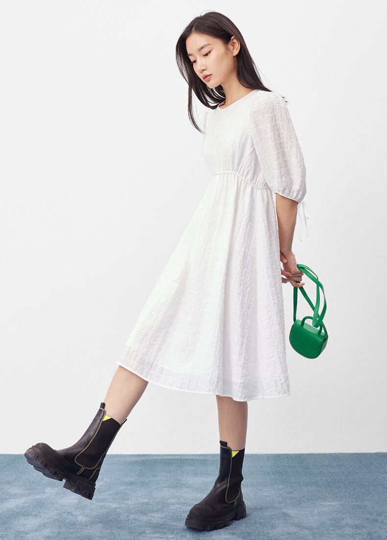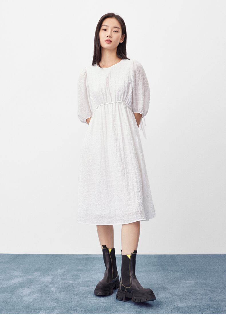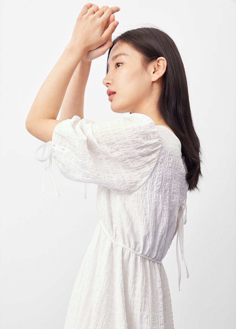甘さと上品さを兼ね備えたレディースワンピース。シンプルなデザインながら、ちょう結びのウエストディテールがアクセントになっています。ホワイトとブラックの2色展開で、どんなシーンでも使いやすいアイテムです。