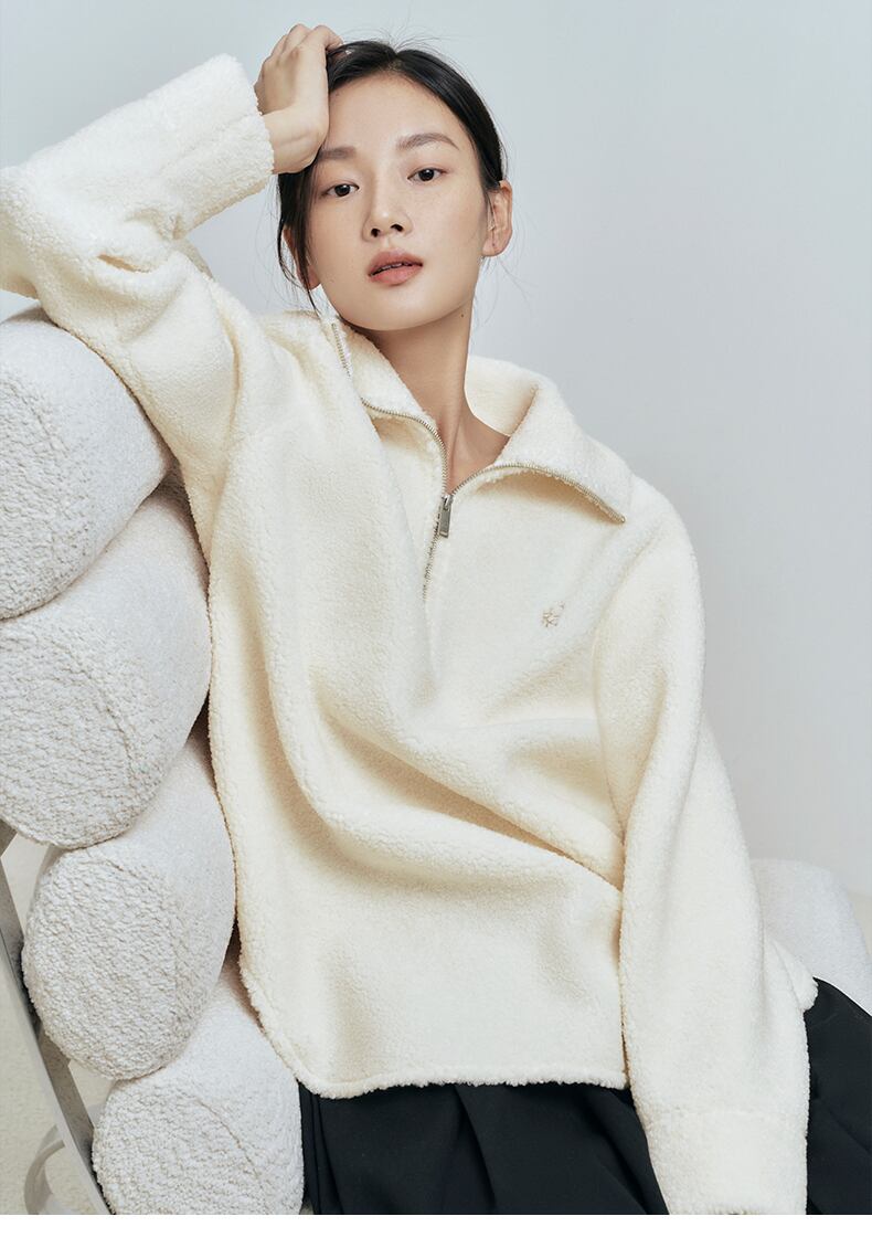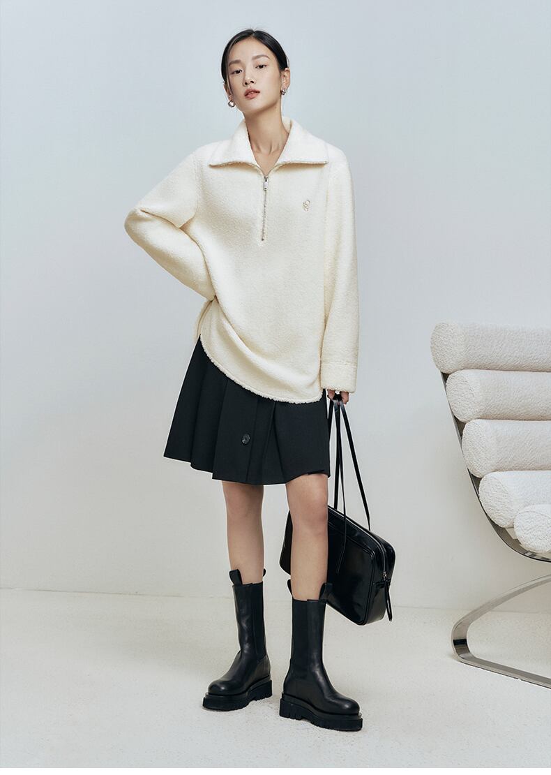 柔らかな風合いのテディセーター。ふんわりとしたシルエットが女性らしさを引き立てます。トレンド感のあるアプリコットの色味も魅力的です。大きすぎないボリューム感で、カジュアルからきれいめまで幅広いスタイルに合わせやすい一枚です。袖ありなので、季節の変わり目も快適に過ごせます。