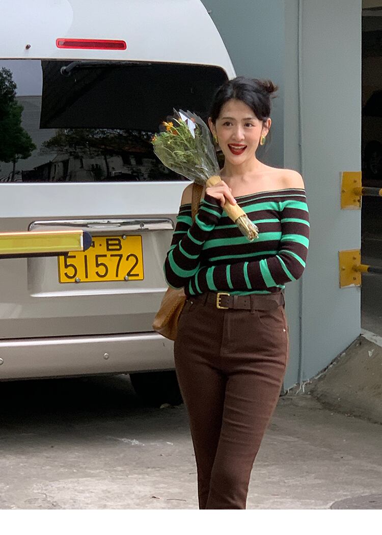 フレンチレトロな雰囲気が魅力のワンショルダーカラーブロックストライプニットセーター。優しい色使いのホワイトとグリーンのストライプが、女性らしさを引き立てます。シンプルでありながら上品さも演出できる一着です。